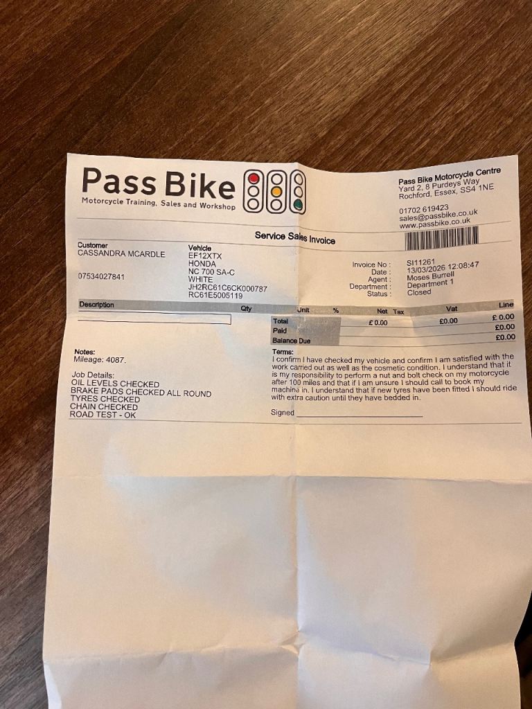 It had a check over 1000 miles ago on the road and was given a clean bill of health with invoice from motorcycle repair shop.