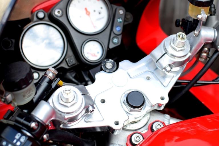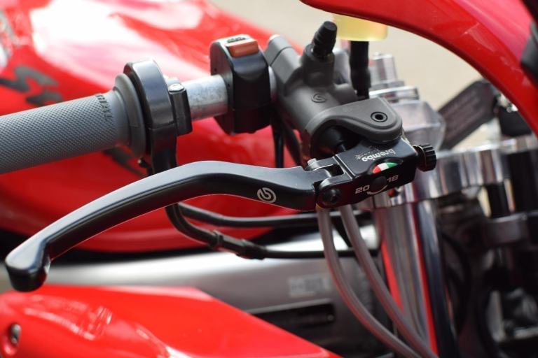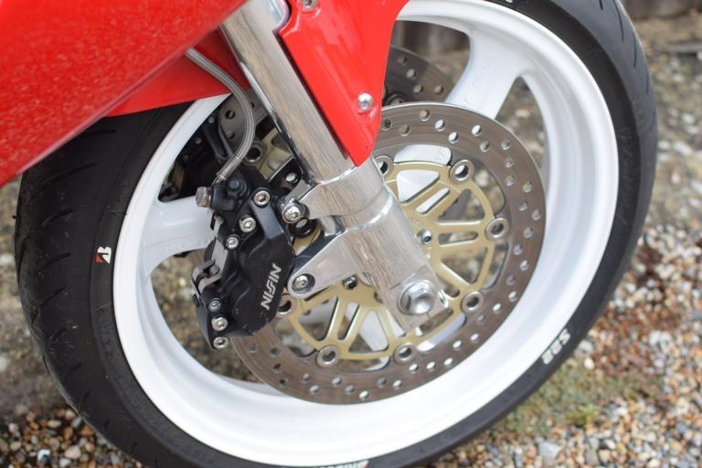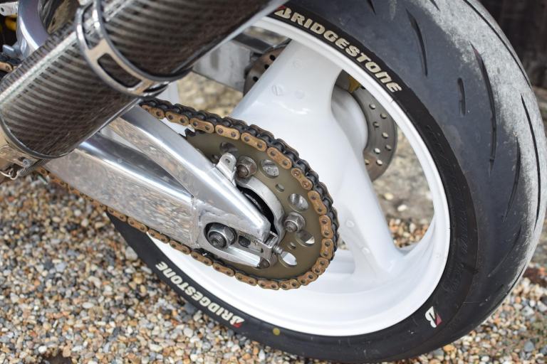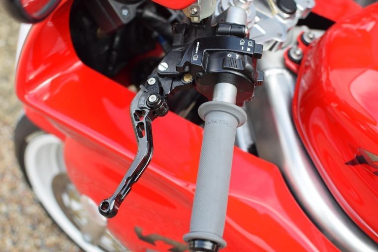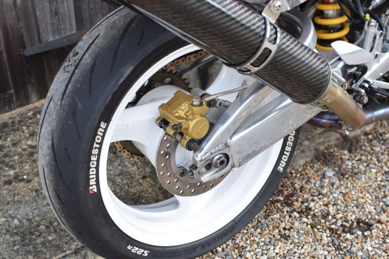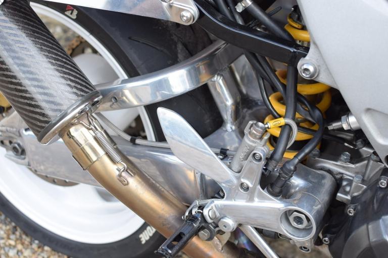 Mechanical modifications included a custom fabricated Fireblade style swingarm with rear shock spacer, lightened flywheel, manual cam chain tensioners, Gold DID chain with new sprockets (+2 teeth rear) new wheel bearings, rebuilt brake calipers with SBS pads and braided lines, Brembo radial front brake master cylinder and lever, rebuilt clutch master/slave cylinders, rebuilt rear suspension linkage with new bearings and seals, twin Micron carbon exhausts with custom high level mounts, new genuine Honda petcock, new fork seals and fluid with K-Tech linear springs, raised bars and all new fluids and filters including K&N air filter