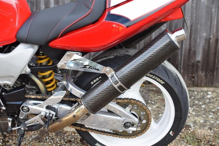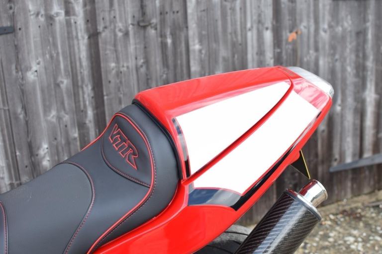 Cosmetic enhancements included a huge amount of beautifully polished parts, such as swingarm, billet top yoke, fork lowers, exhaust hangers (with laser etched Firestorm insignia) rearsets, and various bolts and fasteners. Powdercoated rear subframe and front screen/indicator mount. Powdercoated white wheels, with as new Bridgestone S22 tyres, and decals feature, including front number board, with a race cowl, custom seat with VTR insignia and red piping, Renthal grips, clear rear brake lamp with integrated indicators, flush mount front indicators, stainless mesh to fairings, and a light tinted screen