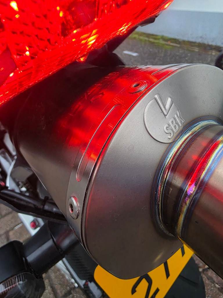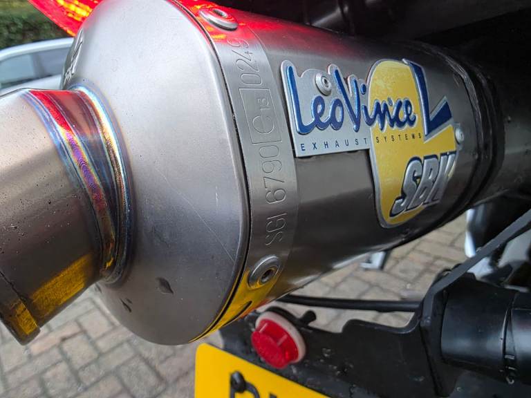It is fitted with a Leo Vince exhaust, which sounds absolutely amazing — a deep, sporty tone that really suits the bike without being obnoxiously loud. It transforms the character of the Fireblade and is a big upgrade over the standard exhaust.