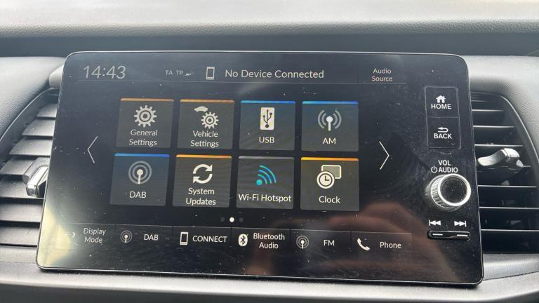 ..Adaptive cruise control, Adjustable speed limiter, Agile handling assist, Bluetooth hands free telephone connection, eCall emergency call system, Econ mode, Electric power steering wheel with variable gear ratio steering, Emergency stop signalling system, Forward collision warning, Front and rear parking sensors, Honda CONNECT with 9'' touchscreen, AM/FM/DAB/Apple Carplay and android auto, Idle stop, Intelligent speed limiter, Lane departure warning system, Lane keep assist system, Low speed following, Multi-information display, Road departure mitigation, Traffic sign recognition, Vehicle stability assist, 'Shark fin' mobile antenna, 180w Power audio system with 6 speakers, 2x USB Front socket (1 data & 1 charge), Remote audio controls on steering wheel, Aspheric door mirrors, Auto wipers, Automatic headlights with on/off timer, Coming/leaving home function, Body colour door handles, Body coloured bumpers, eHEV emblem, Electric adjustable door mirrors, Electric front windows, Electrically folding door mirrors, Heated door mirrors, High beam assist, LED daytime running lights, LED Headlights, LED rear lights, Rear side wing doors, Rear wiper, Silver headlight extension, Single exhaust tailpipe, Third brake light, 3 seat bench in 2nd row, 60/40 split rear bench seat, Cargo net hooks, Climate control air conditioning, Driver and front passenger seat armrests, Driver and passenger front seat pockets, Driver's seat height adjustment, Fabric/leather upholstery, Front accessory power socket, Front head restraints, Front map lights, Front/rear courtesy lights, Isofix child seat restraint mechanism, Isofix points, Magic seat flexibility system, Plating interior door handles, Rear head restraints, Rear parcel shelf, Single front passenger seat, Sunvisors with vanity mirrors, Tilt/telescopic adjustable steering wheel, Tonneau cover, Trunk light, 3x3 point rear seatbelts, Anti-lock braking system (ABS), Brake assist function, Brake hold function, Child locks on rear doors, Collision mitigation braking system, Deflation warning system, Driver knee airbag, Driver SRS airbag (single stage inflation), Driver/Front Passenger airbags, Electric parking brake, Front and rear seat belt with emergency locking retractor, Front and rear side curtain airbag, Front centre airbag, Front side airbags, Hill start assist, Passenger SRS airbag cut-off device, Rear side airbags, Whiplash lessening front headrests, Honda super locks, Immobiliser, Mirrors key fob operation, Remote