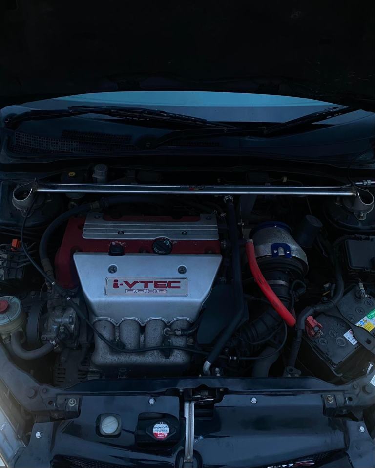 STOCK, UNMOLESTED K20A – NEVER OPENED, NEVER MAPPED – EXACTLY HOW IT LEFT THE FACTORY. FITTED WITH A HIGH-FLOW BLITZ AIR FILTER AND A DEEP 5-INCH BACK BOX THAT SOUNDS INCREDIBLE WHEN VTEC HITS. SITTING ON FULLY ADJUSTABLE COILOVERS FOR PROPER STANCE AND HANDLING.