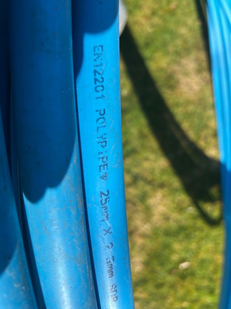 Offering a length of blue polyethylene water pipe, 25mm diameter.