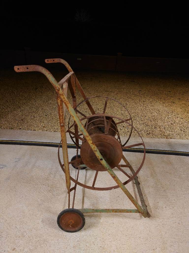 Metal, wheeled revolving barrel that is ideal for housing many metres of hosepipe for storage.