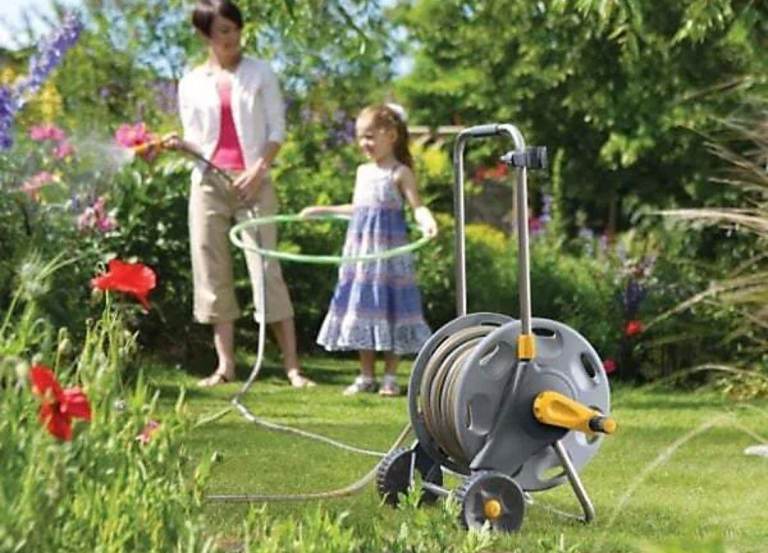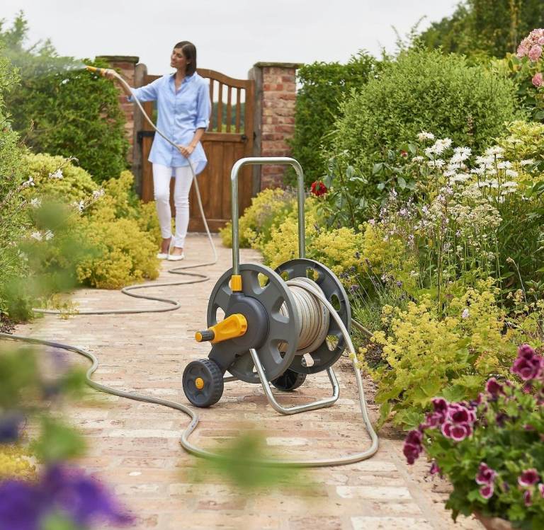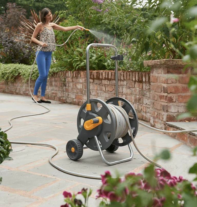 A free standing, wheeled hose cart with an adjustable handle for easy movement around the garden.