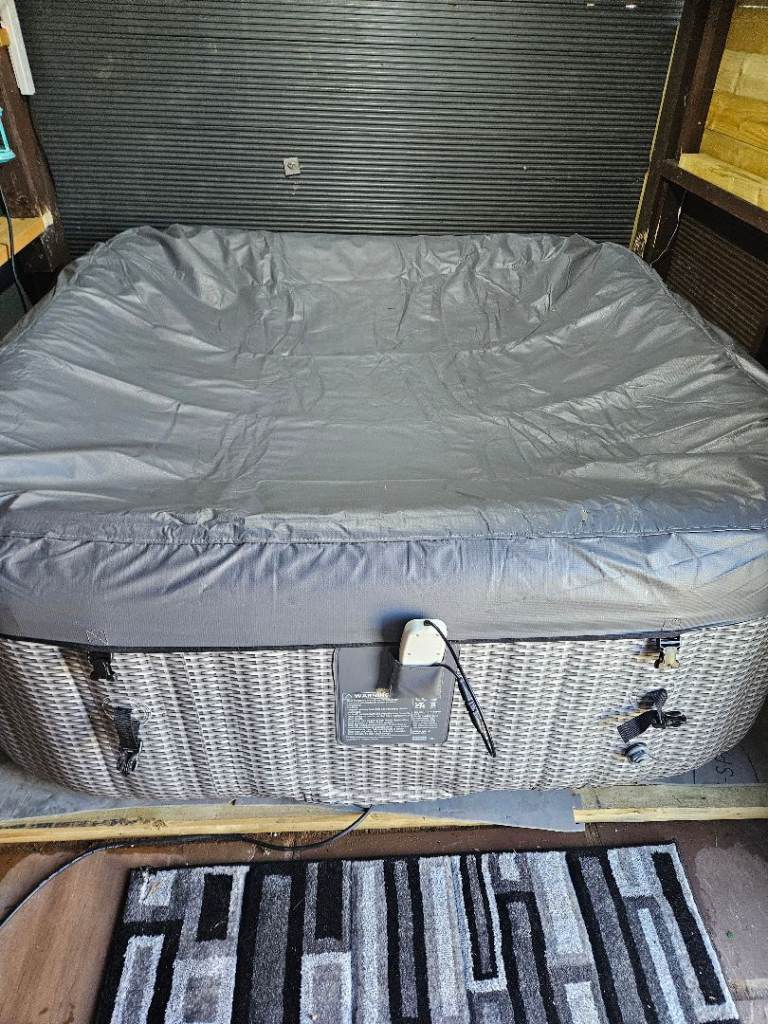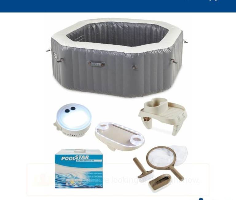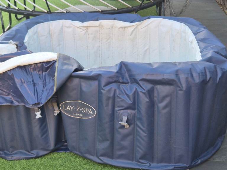 Hot tub for sale with pump, lid and accessories including headrests, drinks tray, pool light, cleaning net and some bits to do with cleaning and water management. Selling as we have moved house and no space for it in the garden. Can be seen inflated if wanted. Collection only please