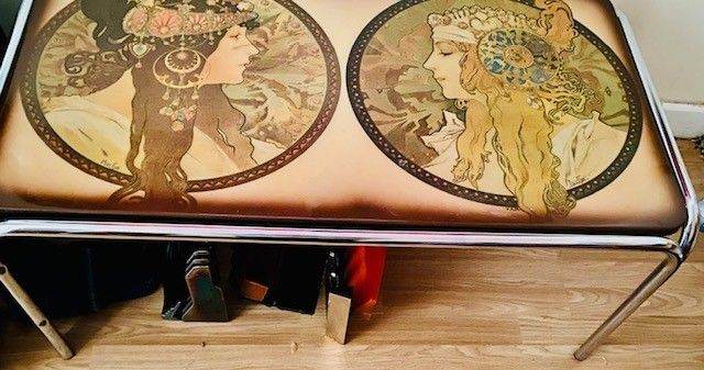 It's still a sublime example of 1970s retro art furniture with chrome tubing legs.The two panels are derived from Mucha's allegorical female figures (similar to the Day/Night or Moon/Stars theme).