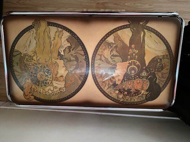 Posting for under a month1970s Mucha reproduction coffee table with chrome legs