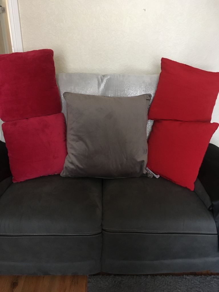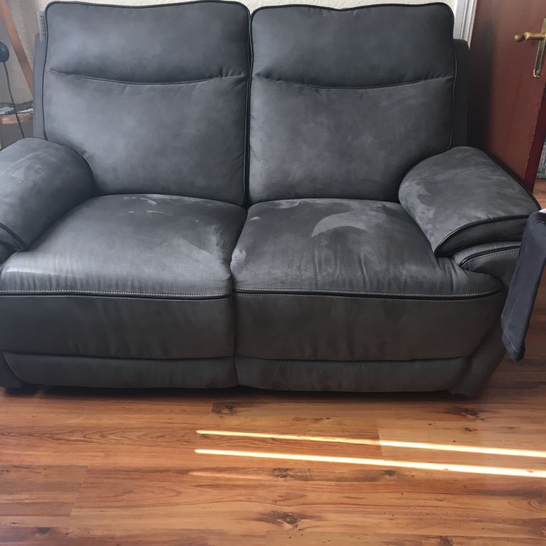 2 two seater manual recliner grey suede effect sofas new £1200 cost £1800 few months ago. Been in sitting room not used