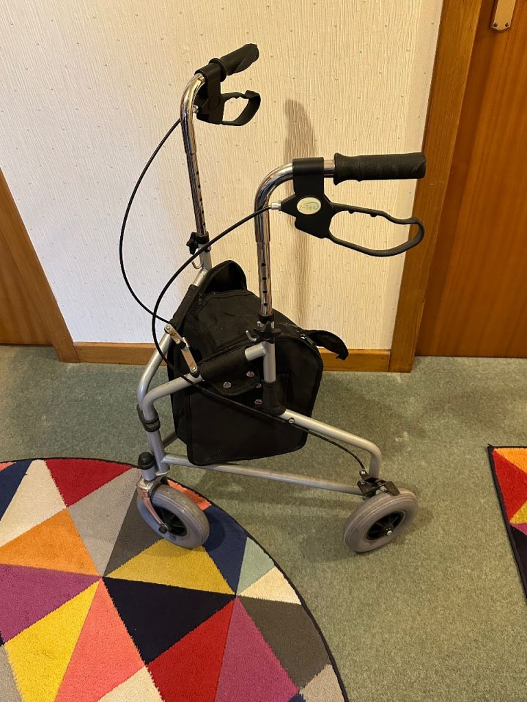 3 wheeled mobility walker folds down for transport comes with wired basket ( not shown) that can be used to hold a small amount of shopping