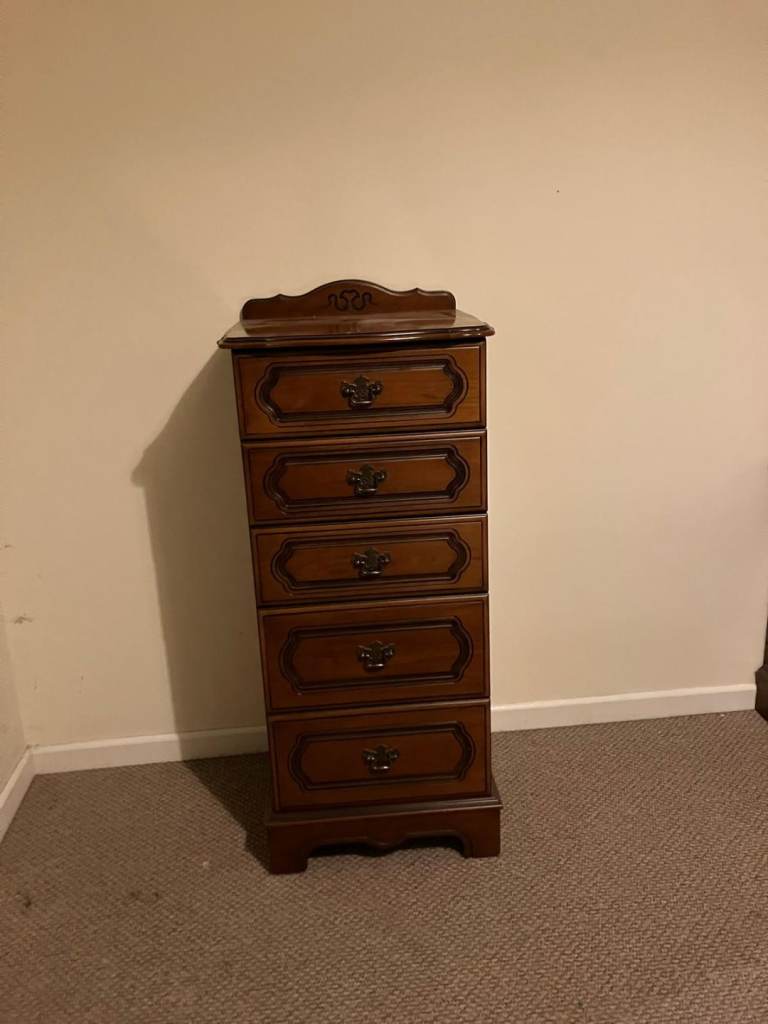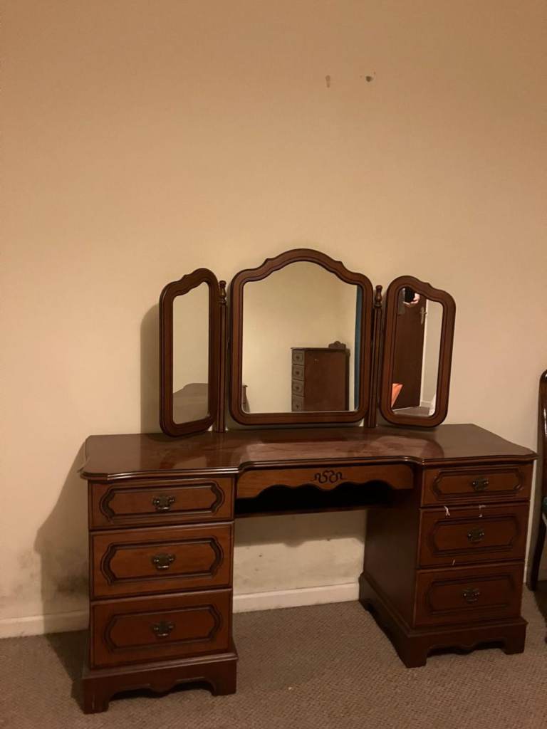 Mahogany bedroom furniture in very good condition. Headboard, 2 sets of drawers, 1 tallboy,dressing table and chair, All for £150