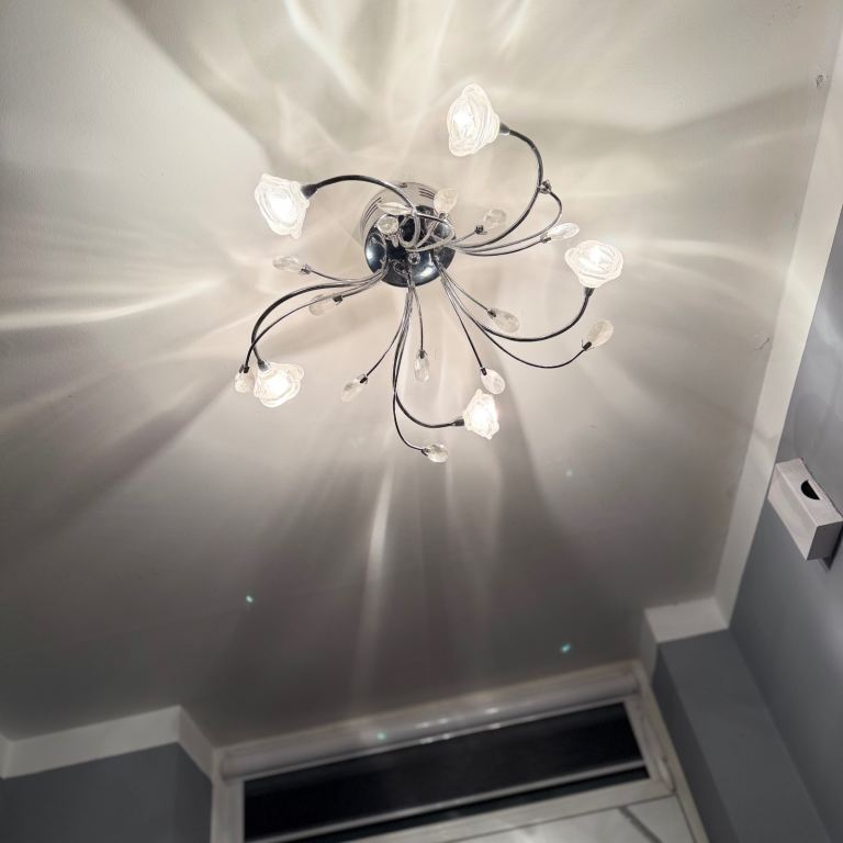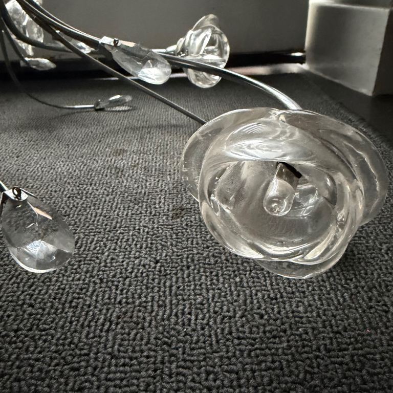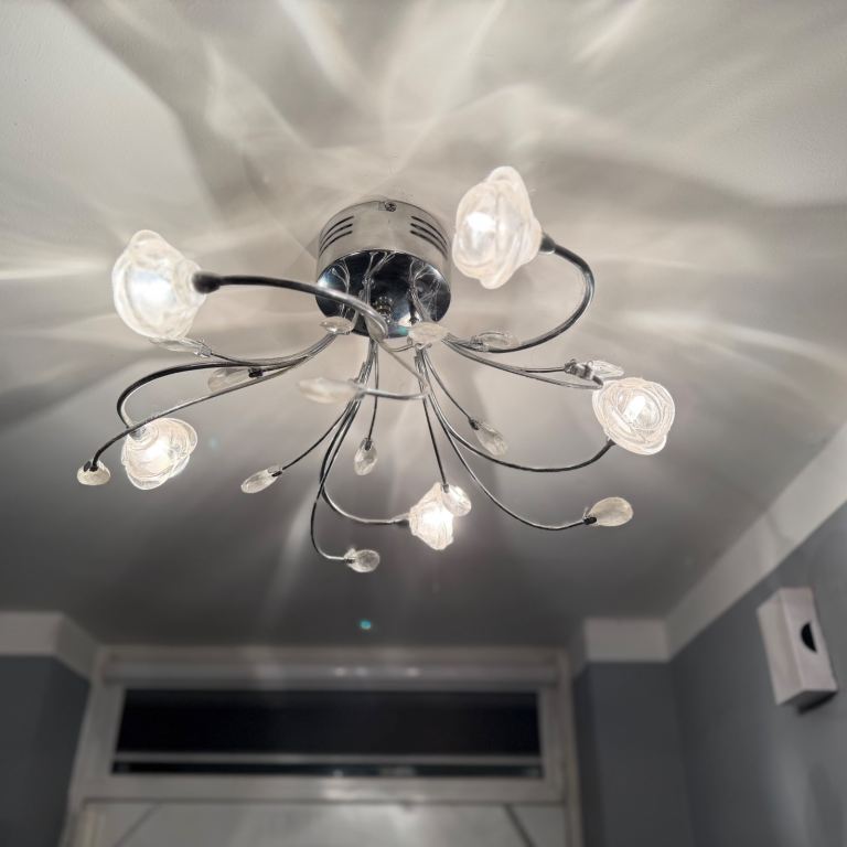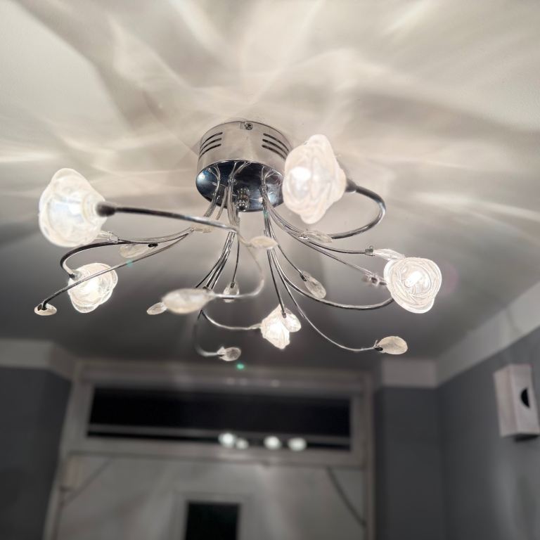 Introducing a beautifully designed ceiling lamp that adds a touch of elegance to any space! This stunning chandelier features graceful, swirling arms adorned with delicate, rose-shaped light fixtures. Each arm is finished in a sleek chrome, creating a modern yet timeless appearance.