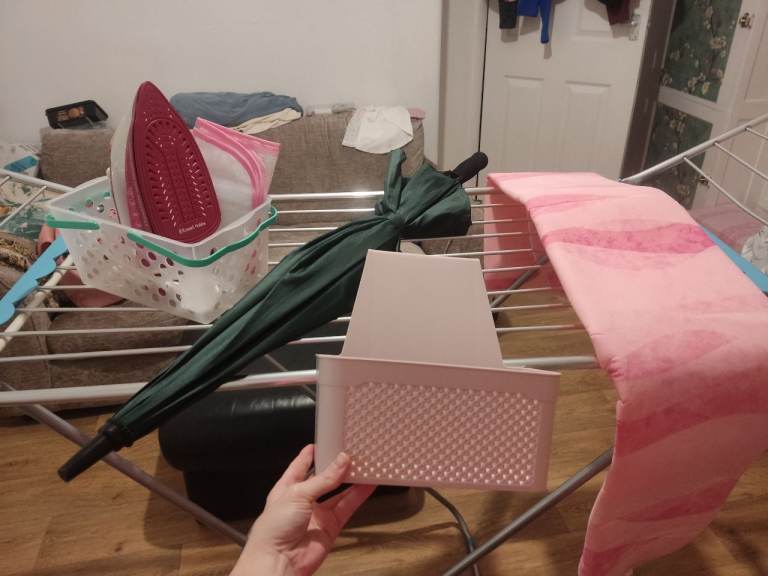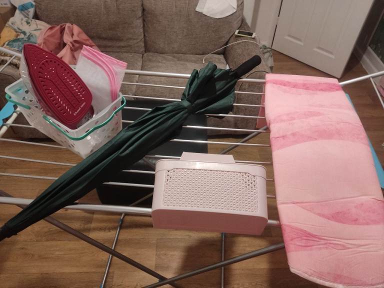 Great bundle 💝 Includes clothesline, iron, ironing board cover, umbrella and two small containers