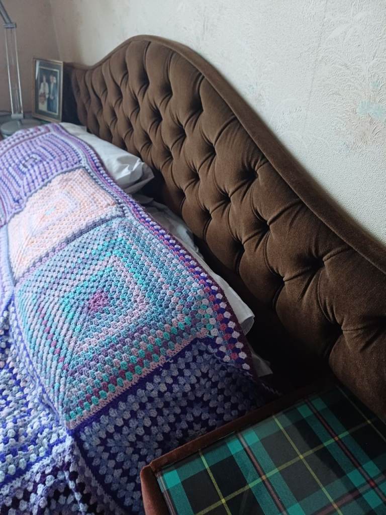 Large double bed headboard unit with 2 sets of 3 drawers. Chocolate brown colour. Dimensions - length 96" x height 42".