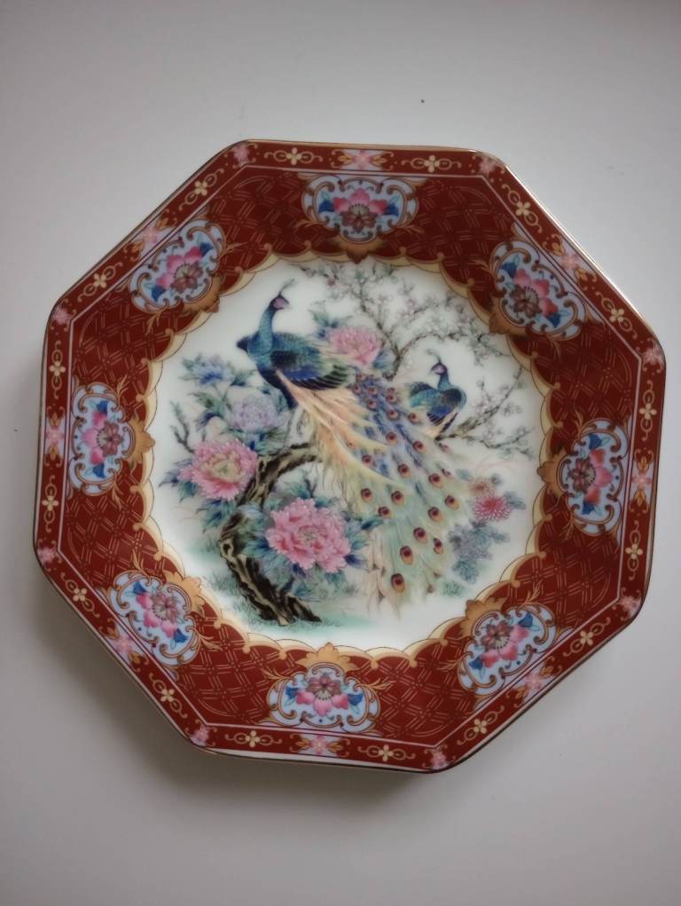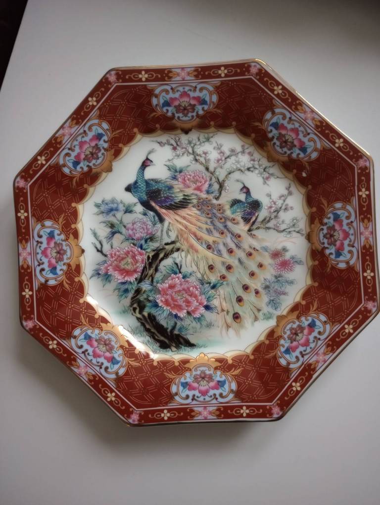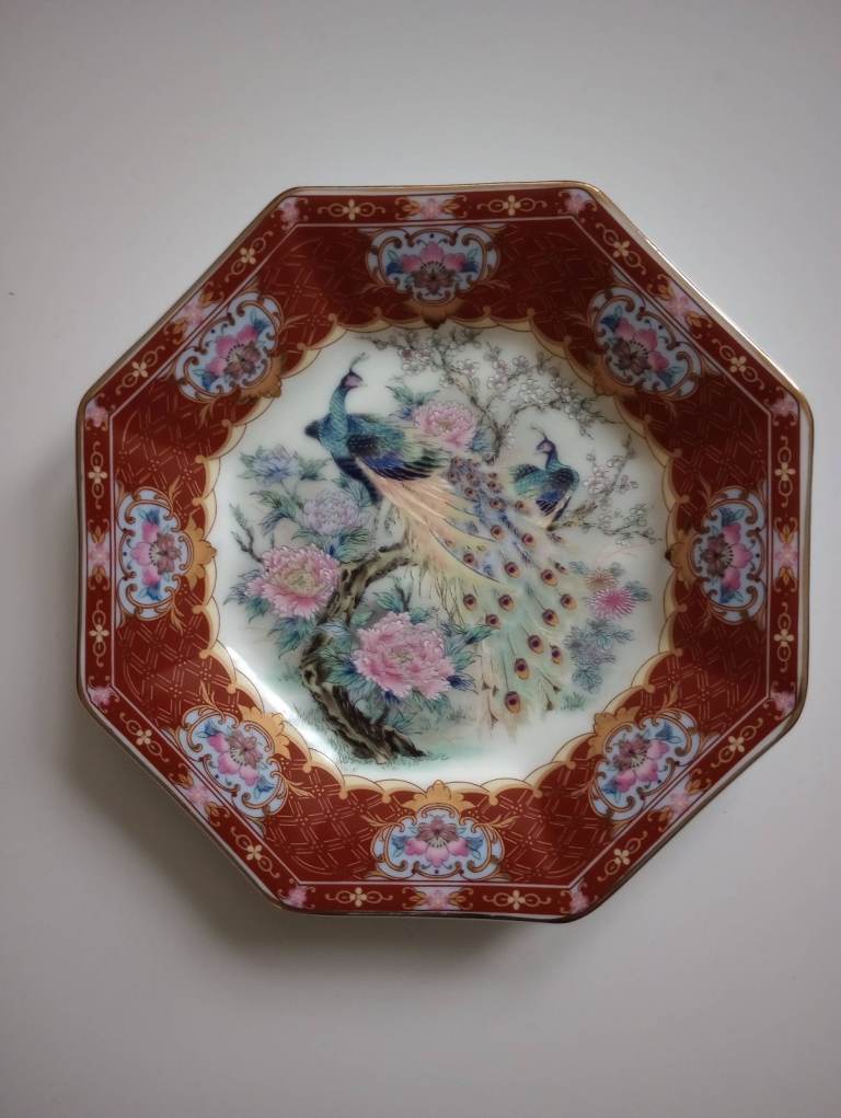 House clearance! 3x Japanese Red Octagonal Porcelaine Plates with Peacocks and Florals, collectible