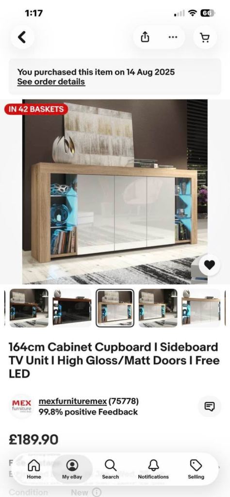 Bought in August for no middle door as it didn’t come with the right bits 🤦🏽♀️ but looks alight like that glass shelves do come off aswell as the lights getting rid as it don’t fit the space I want it to go in collection only wn59pf