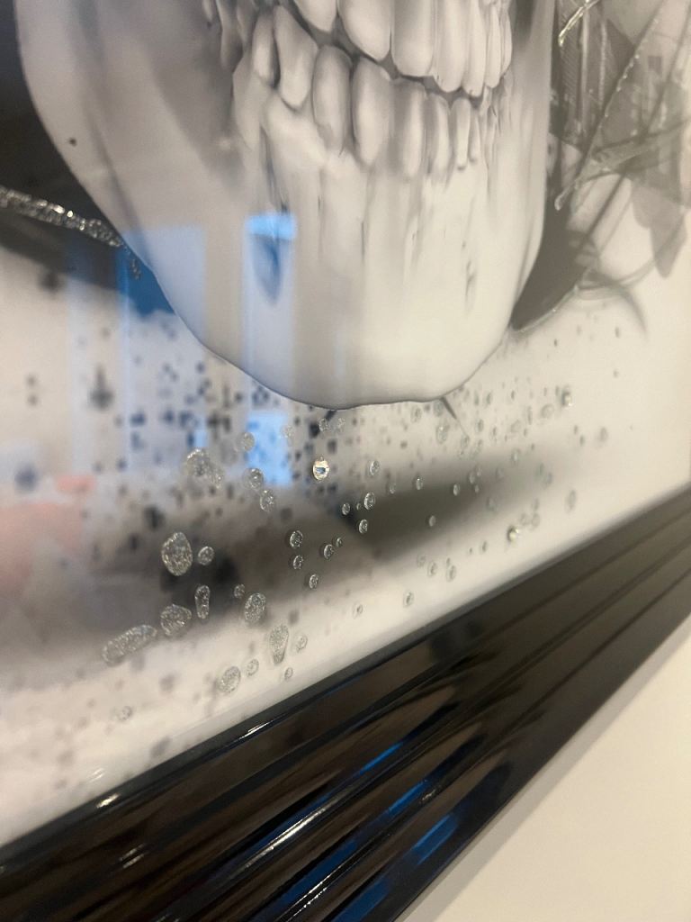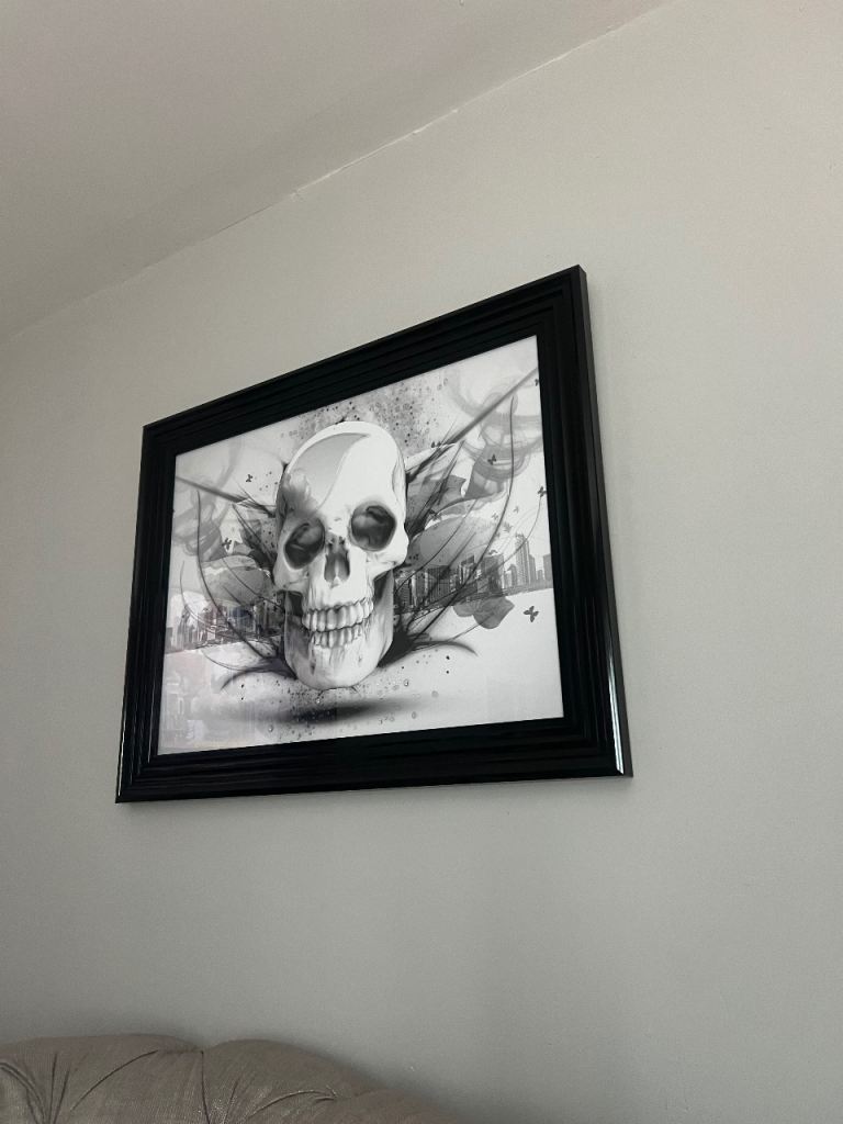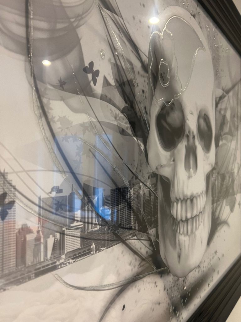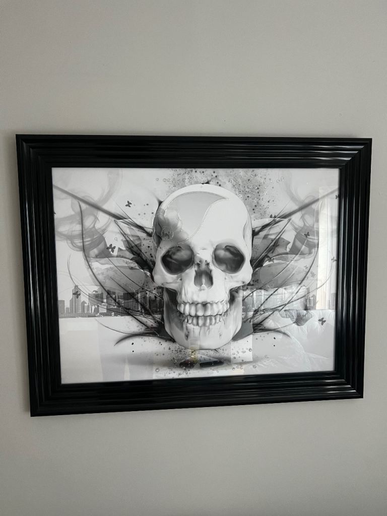 Unique skull & city black/grey/white picture with some 3D effect/gems in front of the picture frame hard to see on the photo if you look carefully. Great picture, excellent condition with gloss black frame.