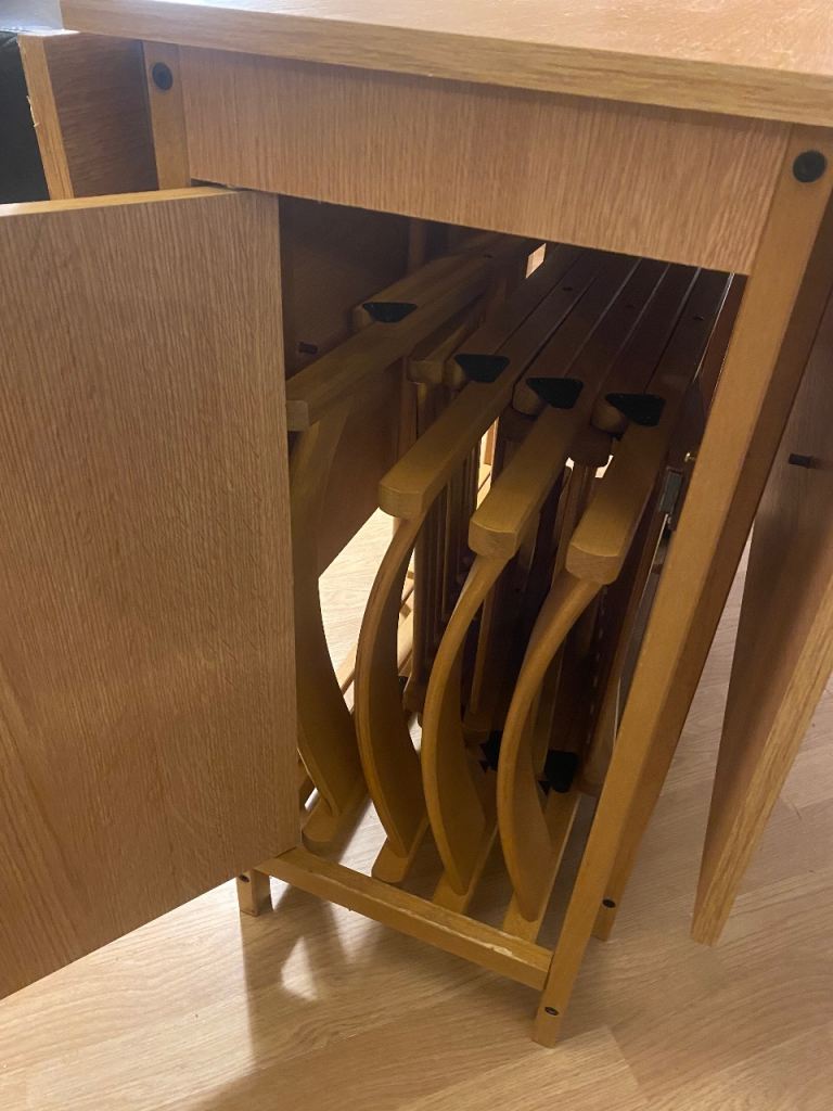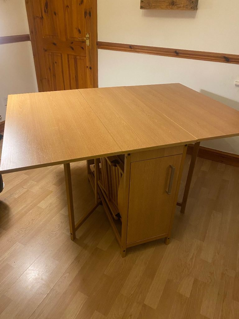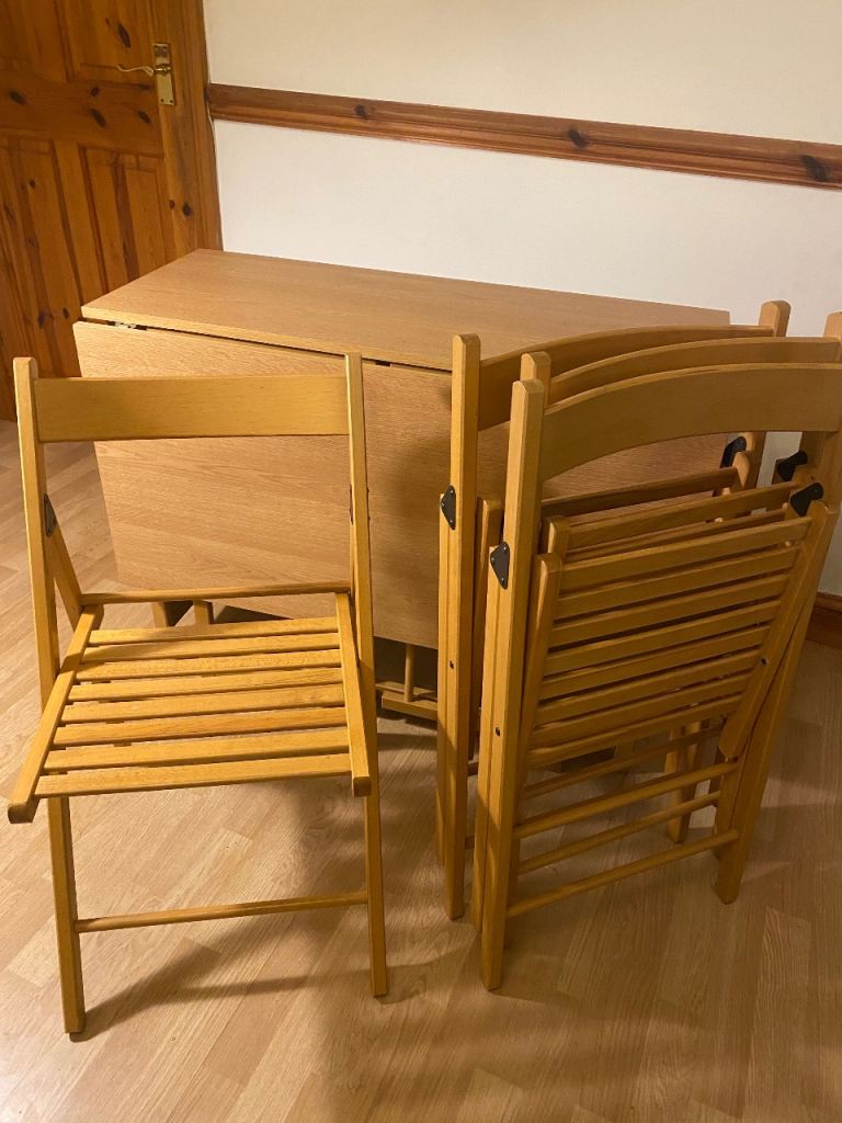Pine fold away table and chairs (x4). Perfect to store away after use to save space. Pick up only.