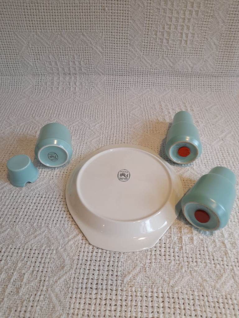 Salt, pepper and mustard pots. Turquoise pots and seagull tray. No chips or cracks. Good condition. Red rubber stoppers a little loose but lovely set. Very collectable