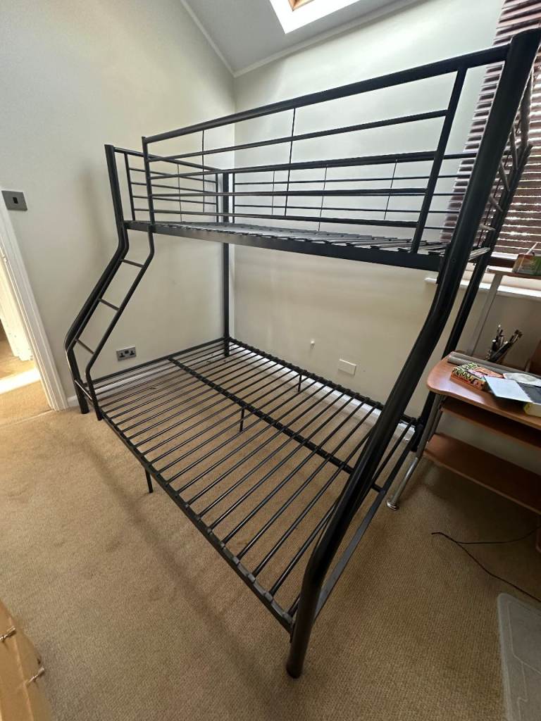 Posting for 11+ yearsSturdy black metal single over double bunk bed frame in good condition