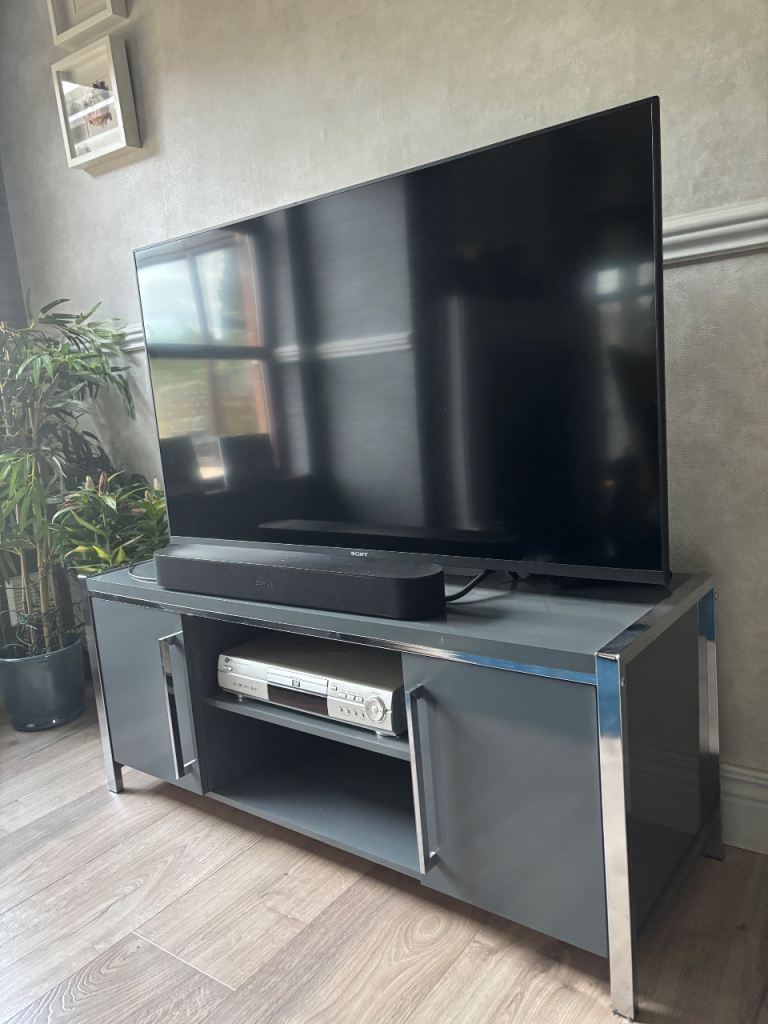 Immaculate modern grey and silver tv display unit. The size is 120w/43d/53 h. As two compact storage units and a middle open display are