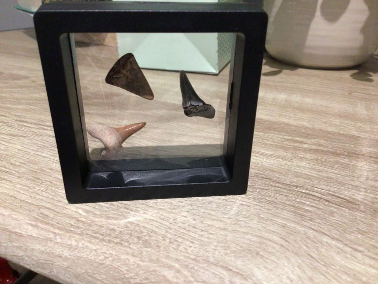 Three sharks teeth in a FREE display box - £5