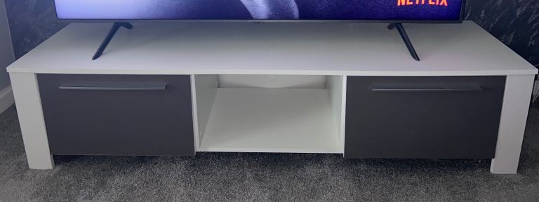 White and grey tv cabinet I have a 60in tv on it at the moment the stand is just over 5 foot. Slight chip at the back but not noticeable once tv is on it
