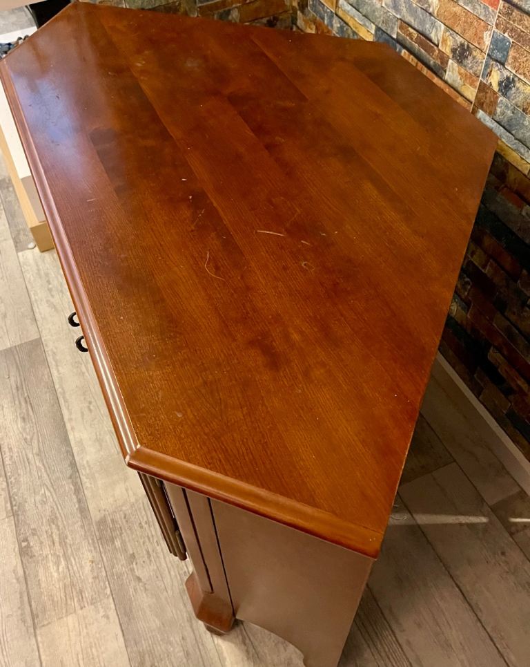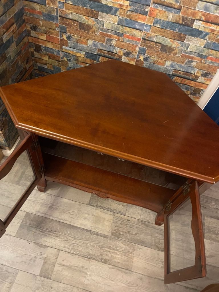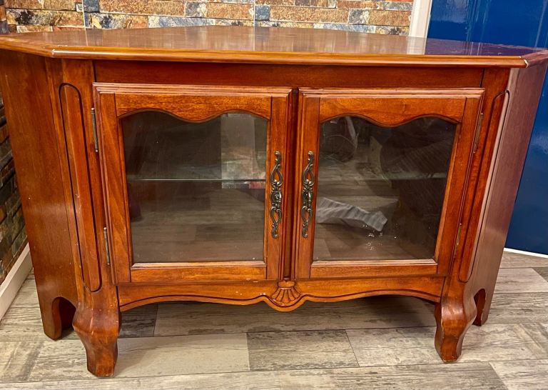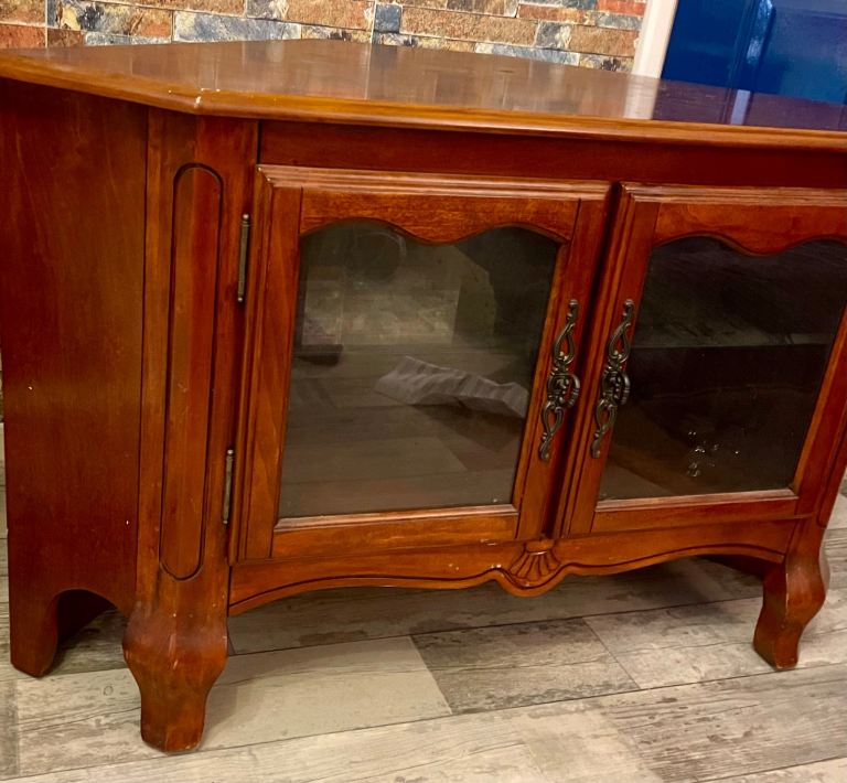 Solid mahogany wood tv unit with glass doors and glass shelf inside good for tv or to recycle and restore just needs dusting and a wipe down
