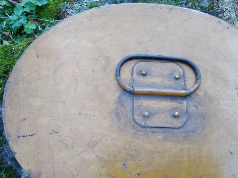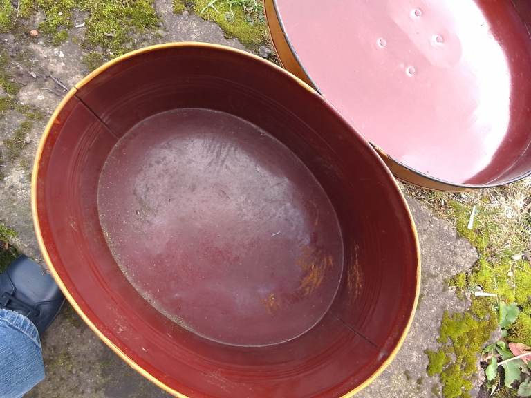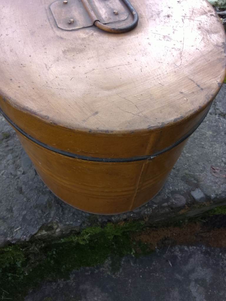 Vintage Victorian metal hat box. Red interior. With handle and clasp fastening. Collection only.
