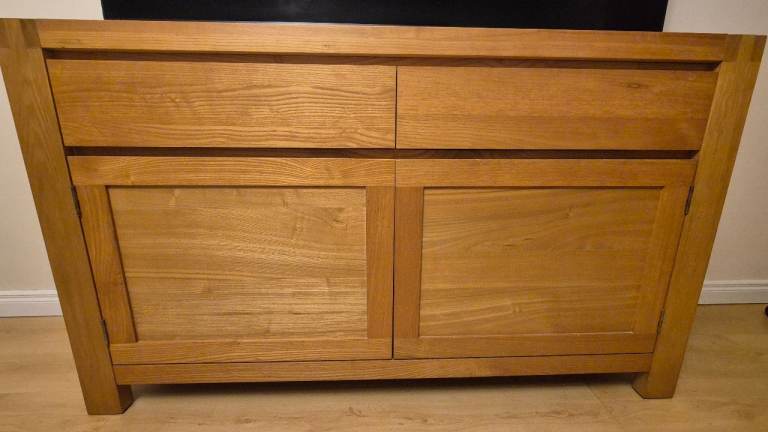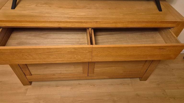 Oak sideboard, has 2 top drawers with 2 cupboards below with shelving so plenty if storage space. H86cm, L146cm and W44cm. Selling for £100.