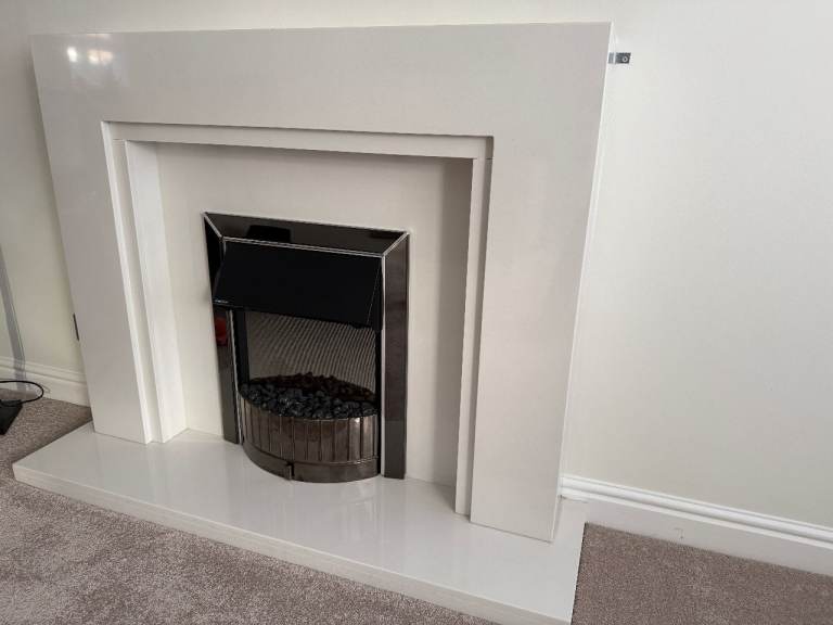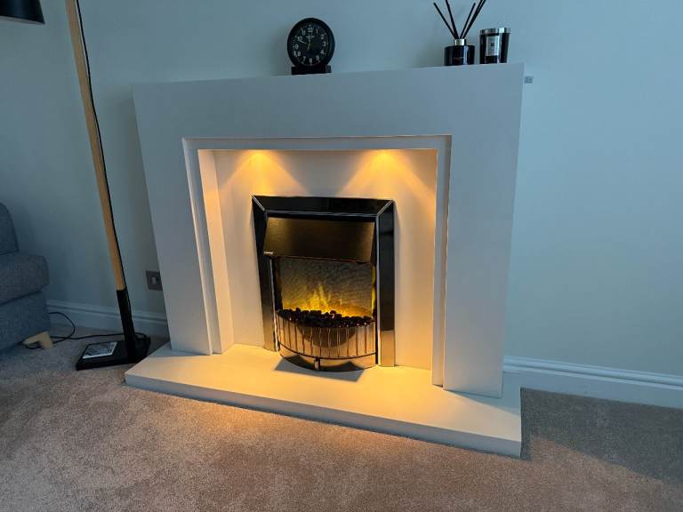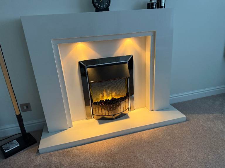 White Marble fire surround in immaculate condition. Built in LED Downlights. Dimplex DLS20BN 2KW Fan heater with Black and White coals. In excellent condition and working order