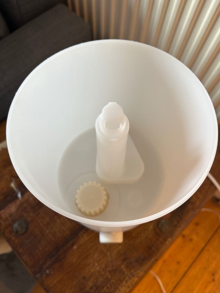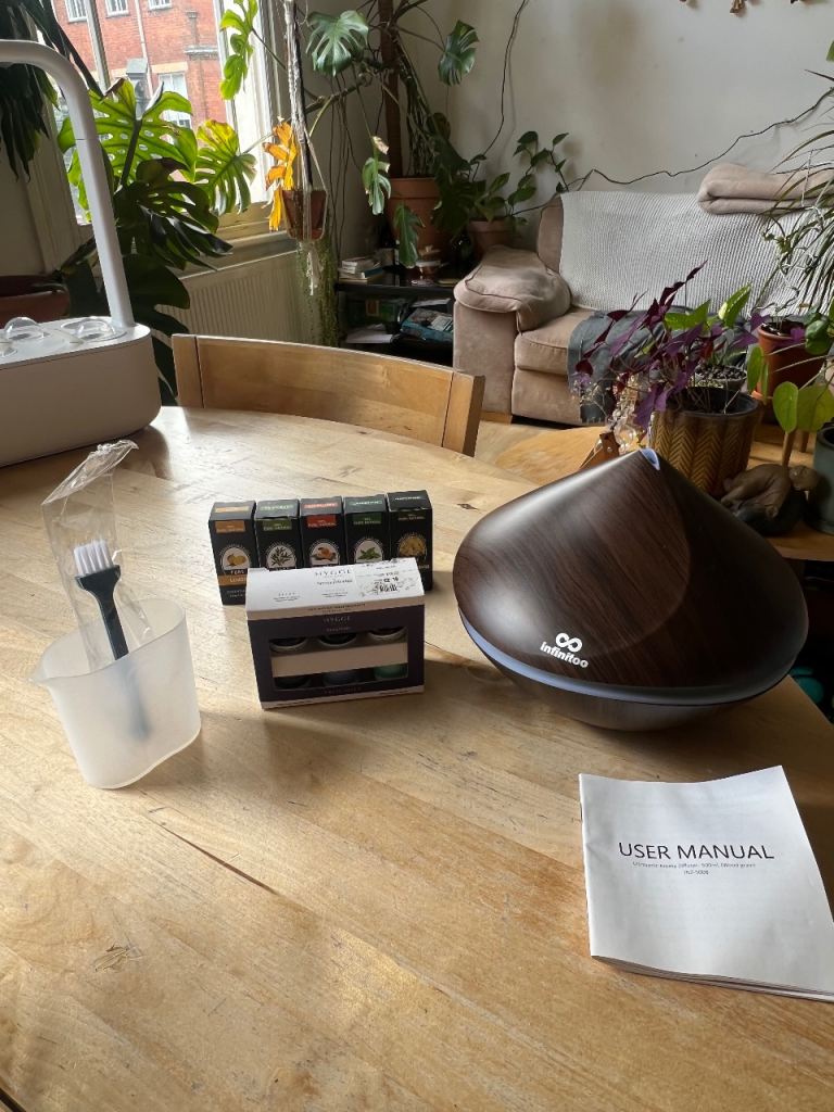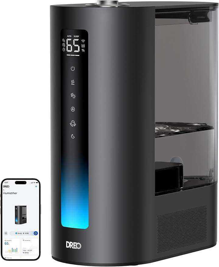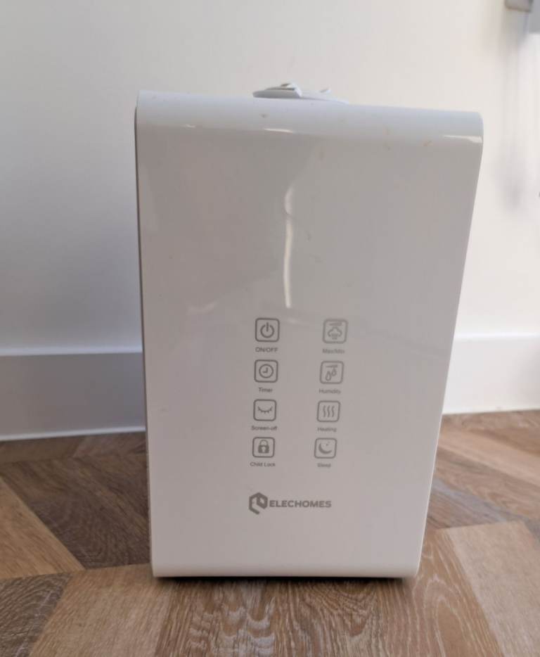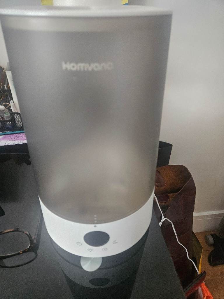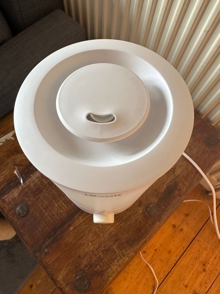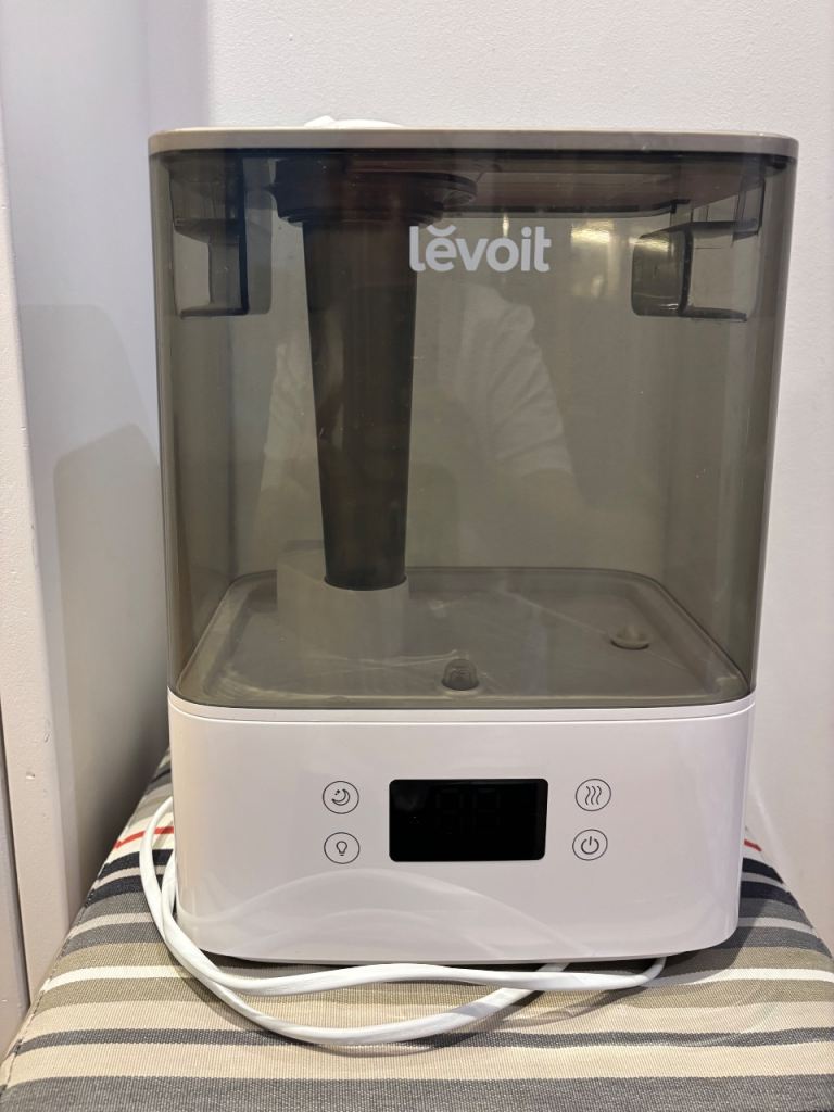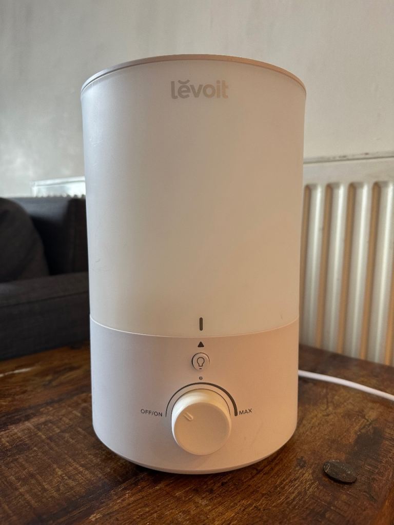 Levoit brand humidifier. Holds 3 litres of water, and has a light feature.