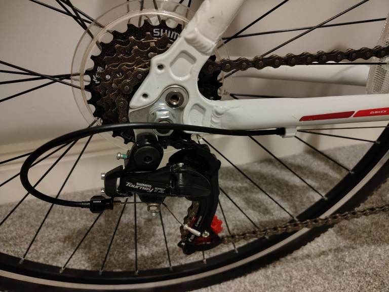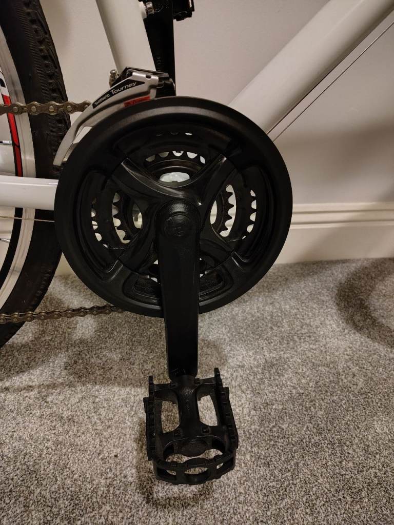 It's white and red, has 6 x 3 = 18 Shimano Tourney TZ gears and Shimano Ez-fire trigger shifters, alloy V brakes.