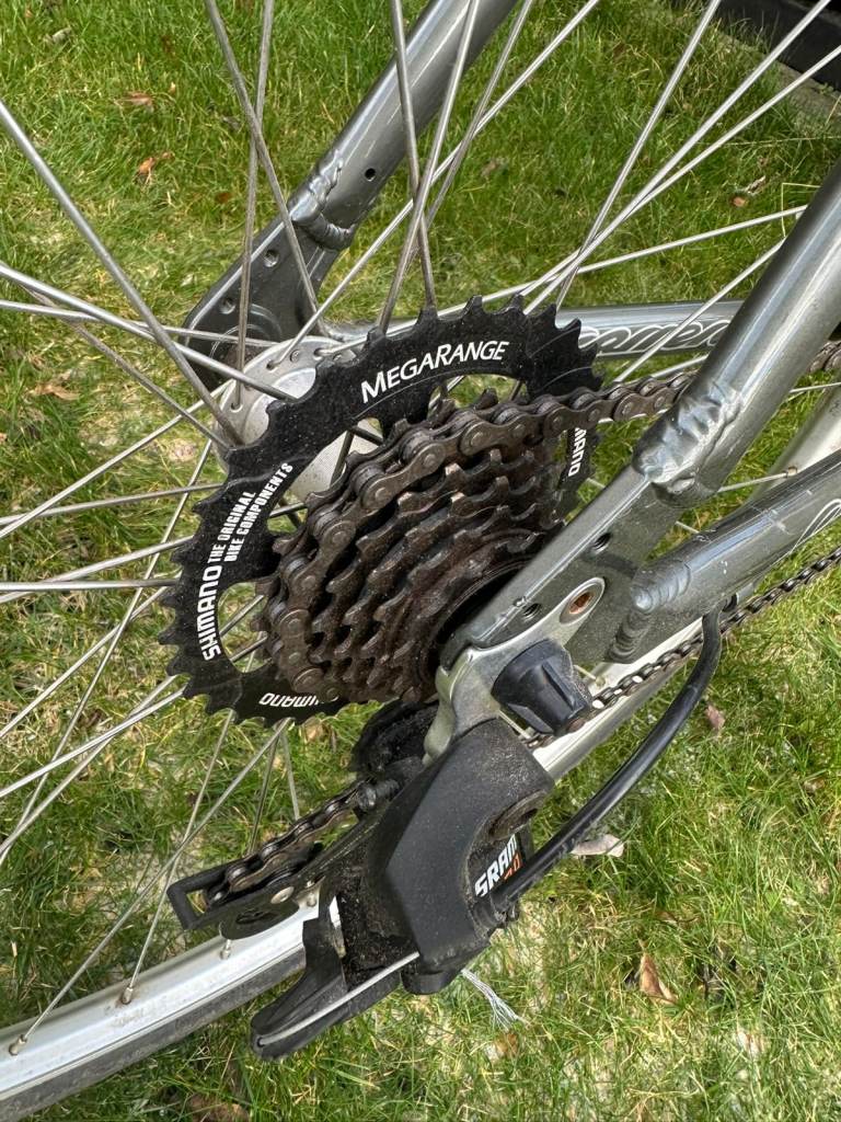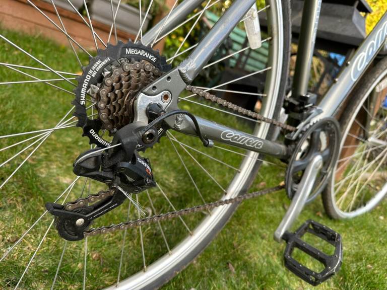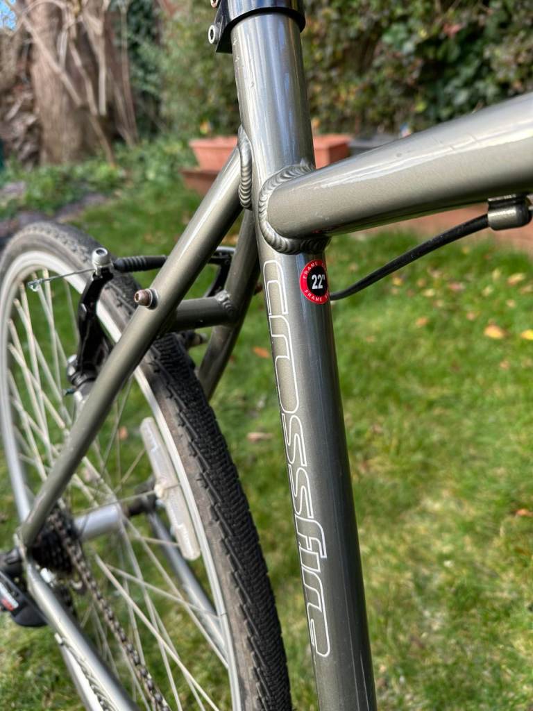 22 inch frame, 700c wheels, 21 gears (3x7), disc brakes.