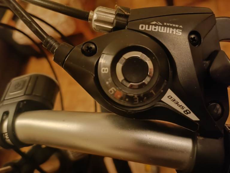 Hybrid bike in full working order. Small size (15 inch / 38–39 cm), 3×8-speed gearing.