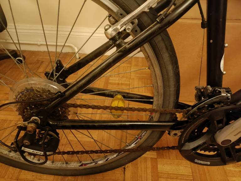 The bike rides smoothly and is very comfortable. The chain shows minor surface rust, but it runs well after being treated with WD-40 and does not affect performance.