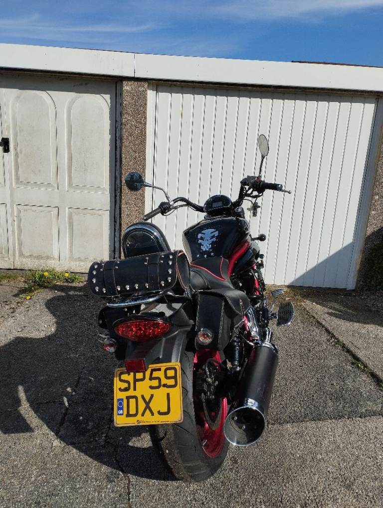 Had for a number of years, with very little use, in excellent condition. With only 5413 miles. Great tyres. Number 59 of only 1000 made, all in the same gloss black and candy trim. These have the 647cc V twin Suzuki engine with fuel injection with circa 79 BHP. Always kept garaged and covered. New battery fitted last April and bike started every 6 months. I did the plugs, oil & filter 2 years ago but didn't end up using it. Comes with a few added extras such as heated grips, footboards, rear rack & sissy bar, tool roll and saddle bags. Because it's been on sorn there's no MOT, but no reason why it wouldn't sail through as have done previously, the high beam indicator has never worked, guessing a led gone dry but light's work fine and was never a failure. Have both keys and V5. Open to very sensible offers as not desperate to sell it.