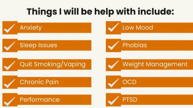 Currently I am looking for volunteers who would benefit from help with anxiety, low mood, depression, sleep issues, IBS, stress,, phobias, fears, PTSD, OCD, smoking, vaping, weight management and chronic pain, so if these areas are of interest to you get in touch.