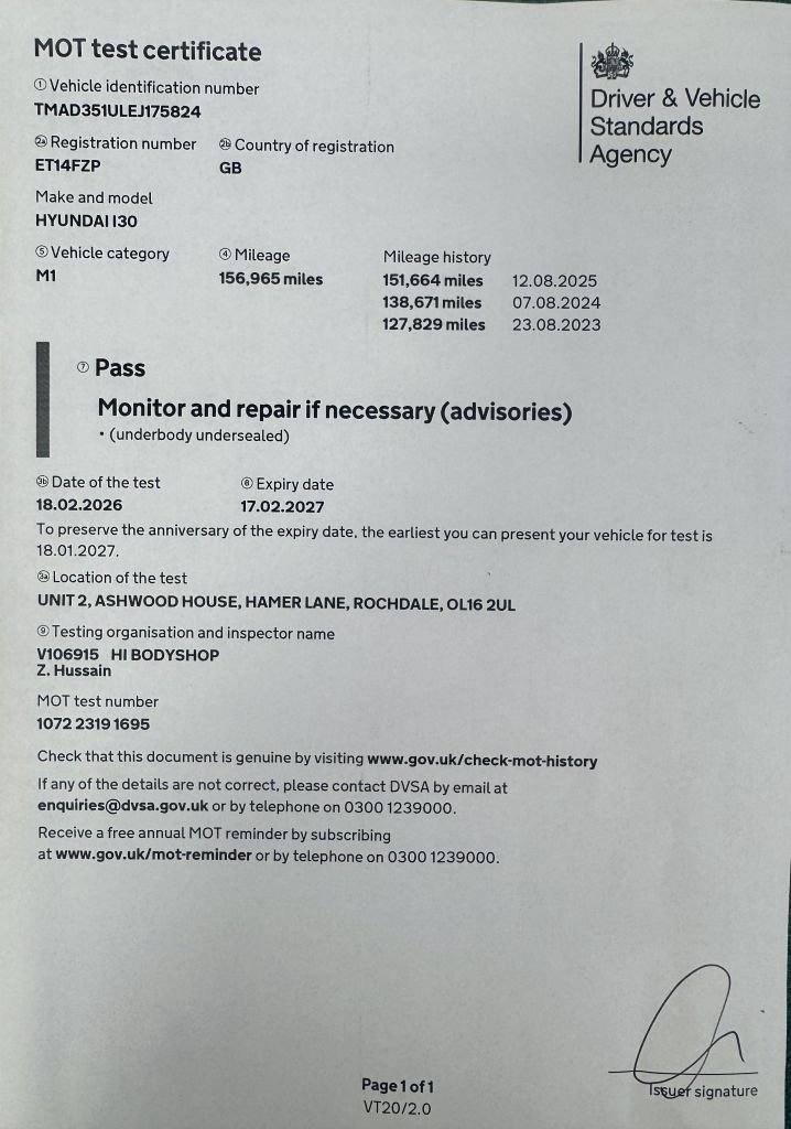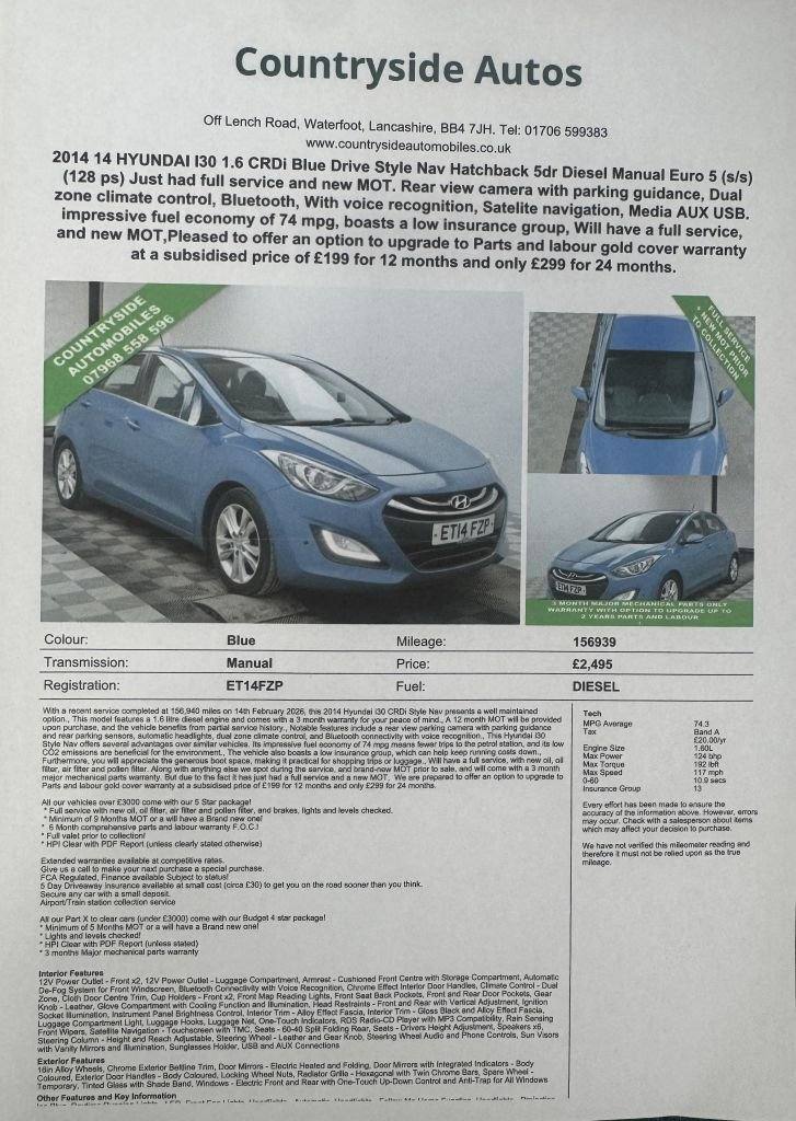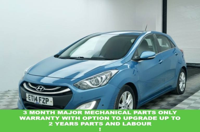 With a recent service completed at 156,940 miles on 18th February 2026, Great prvious service history also. see pics. this 2014 Hyundai i30 CRDi Style Nav presents a well maintained option. This model features a 1.6 litre diesel engine and comes with a 3 month warranty for your peace of mind. A 12 month MOT will be provided upon purchase, and the vehicle benefits from partial service history. Notable features include a rear view parking camera with parking guidance and rear parking sensors, automatic headlights, dual zone climate control, and Bluetooth connectivity with voice recognition. This Hyundai i30 Style Nav offers several advantages over similar vehicles. Its impressive fuel economy of 74 mpg means fewer trips to the petrol station, and its low CO2 emissions are beneficial for the environment. The vehicle also boasts a low insurance group, which can help keep running costs down. Furthermore, you will appreciate the generous boot space, making it practical for shopping trips or luggage. Will have a full service, with new oil, oil filter, air filter and pollen filter. Along with anything else we spot during the service, and brand-new MOT prior to sale, and will come with a 3 month major mechanical parts warranty. But due to the fact it has just had a full service and a new MOT, We are prepared to offer an option to upgrade to Parts and labour gold cover warranty at a subsidised price of £199 for 12 months and only £299 for 24 months. All our vehicles over £3000 come with our 5 Star package! * Full service with new oil, oil filter, air filter and pollen filter, and brakes, lights and levels checked. * Minimum of 9 Months MOT or a will have a Brand new one! * 6 Month comprehensive parts and labour warranty F.O.C.! * Full valet prior to collection! * HPI Clear with PDF Report (unless clearly stated otherwise) Extended warranties available at competitive rates. Give us a call to make your next purchase a special purchase. FCA Regulated, Finance available Subject to status! 5 Day Driveaway insurance available at small cost (circa £30) to get you on the road sooner than you think. Secure any car with a small deposit. Airport/Train station collection service All our Part X to clear cars (under £3000) come with our Budget 4 star package! * Minimum of 5 Months MOT or a will have a Brand new one! * Lights and levels checked! * HPI Clear with PDF Report (unless stated) * 3 months Major mechanical parts warranty. 3 M WARRANTY WITH OPTION TO UPGRADE, METALIC PAINT 16 INCH ALLOY WHEELS, CRUISE CONTROL WITH SPEED LIMITER, R PARKING SENSORS GREAT SERVICE HISTORY, LOOKS AND DRIVES SUPERB V CLEAN EXAMPLE, Ice Blue, 12V Power Outlet - Front x2, 12V Power Outlet - Luggage Compartment, 16in Alloy Wheels, ABS - Anti-Lock Brake System, Airbags - Driver, Airbags - Front Passenger, Airbags - Front Side, Airbags - Full Length Curtain, Alarm, Armrest - Cushioned Front Centre with Storage Compartment, Automatic De-Fog System for Front Windscreen, BAS - Brake Assist System, Bluetooth Connectivity with Voice Recognition, Childproof Rear Door Locks, Chrome Effect Interior Door Handles, Chrome Exterior Beltline Trim, Climate Control - Dual Zone, Cloth Door Centre Trim, Cruise Control with Speed Limiter, Cup Holders - Front x2, Daytime Running Lights - LED, Deadlocks, Door Mirrors - Electric Heated and Folding, Door Mirrors with Integrated Indicators - Body Coloured, EBD - Electronic Brake Force Distribution, ESP - Electronic Stability Programme, ESS - Emergency Stop Signal, Exterior Door Handles - Body Coloured, Flex Steering, Front Fog Lights, Front Map Reading Lights, Front Parking Sensors, Front Passenger Airbag De-Activation Switch, Front Seat Back Pockets, Front and Rear Door Pockets, Gear Knob - Leather, Glove Compartment with Cooling Function and Illumination, HAC - Hill-Start Assist Control, Head Restraints - Front and Rear with Vertical Adjustment, Headlights - Automatic, Headlights - Follow Me Home Function, Headlights - Projection with Static Cornering Function, ISOFIX Child Seat Anchorage Points - Rear - Outer Rear, Ignition Socket Illumination, Instrument Panel Brightness Control, Interior Trim - Alloy Effect Fascia, Interior Trim - Gloss Black and Alloy Effect Fascia, Locking Wheel Nuts, Luggage Compartment Light, Luggage Hooks, Luggage Net, One-Touch Indicators, Parking Sensors - Rear, Power Assisted Steering, RDS Radio-CD Player with MP3 Compatibility, Radiator Grille - Hexagonal with Twin Chrome Bars, Rain Sensing Front Wipers, Rear Spoiler with High-Mounted Brake Light, Rear View Parking Camera with Parking Guidance System, Remote Central Locking, Satellite Navigation - Touchscreen with TMC, Seatbelt Reminder, Seats - 60-40 Split Folding Rear, Seats - Drivers Height Adjustment, Spare Wheel - Temporary, Speakers x6, Speed Sensitive Automatic Door Locking, Steering Column - Height and Reach Adjustable, Steering Wheel - Leather and Gear Knob, Steering Wheel Audio