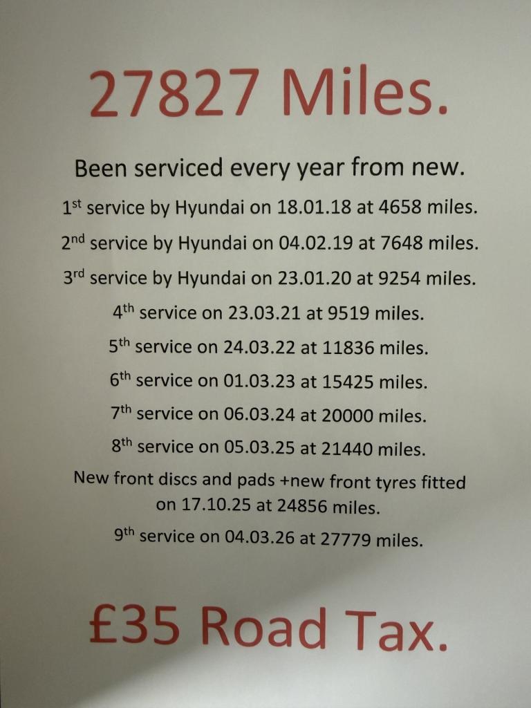 2017 Hyundai I20 1.2 Go, 5 door hatchback. Comes with 2 keys, full service history X9 and only 27827 miles from new. Only £35 for 1 year's road tax. This car has been serviced every year from new and is backed up with invoices and previous Mot's. Recently had a new battery fitted. 1st service by Hyundai on 18.01.18 at 4658 miles. 2nd service by Hyundai on 04.02.19 at 7648 miles. 3rd service by Hyundai on 23.01.20 at 9254 miles. 4th service on 23.03.21 at 9519 miles. 5th service on 24.03.22 at 11836 miles. 6th service on 01.03.23 at 15425 miles. 7th service on 06.03.24 at 20000 miles. 8th service on 05.03.25 at 21440 miles. New front discs and pads +new front tyres fitted on 17.10.25 at 24856 miles.9th service on 04.03.26 at 27779 miles. Spec as follows, Remote central locking, Power steering, Dab radio cd player with steering wheel controls, USB port, Auxiliary connector for an external music device, Bluetooth hands free phone integration with voice control, Front and rear parking sensors, Cruise control, Rear privacy glass, Cooling glove box, Auto headlights, Rain sensing wipers, Illuminating courtesy mirrors, Front fog lights, Lane departure, variable boot floor, Alarm, Front and rear Hyundai carpet mats, Front and rear electric windows, Air conditioning, Trip computer, Electric and heated door mirrors, Alloy wheels, Bluetooth music streaming, Led daytime running lights, Traction control, Abs, spare wheel, Isofix child seat anchor points, Rear headrests, TPMS, Adjustable intermittent wipers, Height adjustable driver's seat, Adjustable steering column, Multiple air bags.. Cars for your family from a small family business established in 1977. Finance available plus debit cards are welcome. To view around 30 similar vehicles please click on to our website. Thanks for looking.