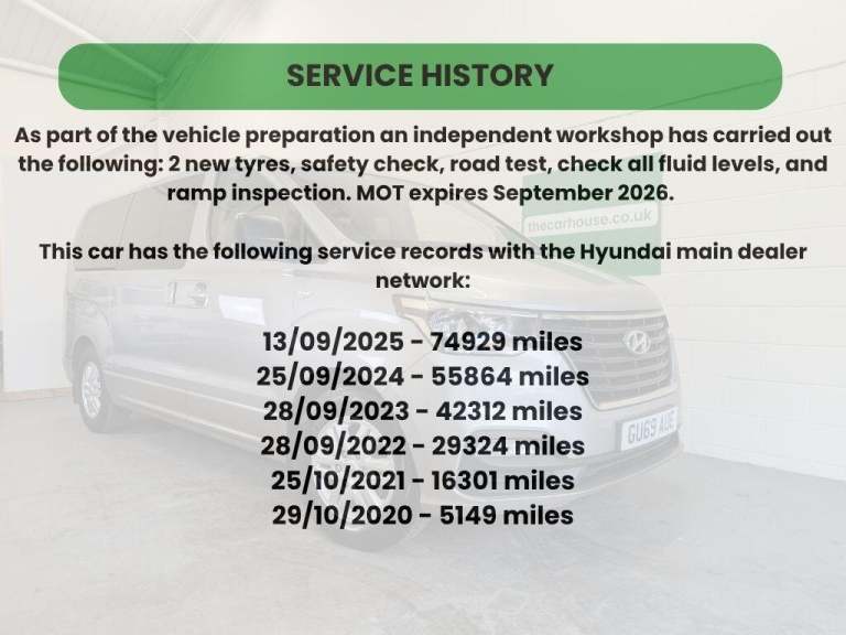 Here's a very nice example of the i800, the car has been owned privately and has all services completed annually at the previous owners local Hyundai main dealer (see pics for service history). These make an excellent family bus, being an 8 seater with plenty of room all round and from personal experience the sliding doors are a god send in car parks! There's also nice specification, including reversing camera, heated front seats, rear seat air conditioning, bluetooth connectivity and satellite navigation. The car has also had a tow bar fitted, with 7 pin electrics currently. Sold with 2 keys.
