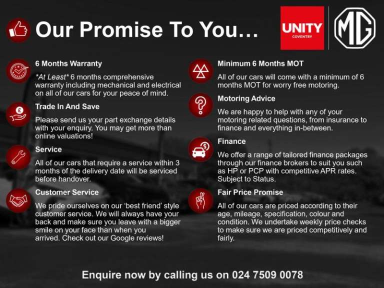 Welcome to Unity MG Coventry – your official MG main dealer for Coventry and Warwickshire. Based at our modern, carbon-neutral showroom in Pilot Park, we offer a relaxed and professional environment with over six years of MG expertise. Explore the latest MG range including the award-winning MG4 EV, HS Hybrid+, and ZS family SUV, plus a wide choice of Approved Used vehicles from MG and other top brands. Our site features 18 customer EV charging points, ample parking, and a welcoming lounge area. As a Motability-accredited and Cyberster-approved dealer, we’re committed to providing transparent advice, flexible finance, and a straightforward buying experience. Every vehicle is inspected and prepared to main-dealer standards, with the balance of manufacturer warranty or RAC cover included. We also offer servicing, MOTs, repairs, parts, and nationwide delivery. Visit Unity MG Coventry today and discover the smarter way to buy and own your next car.