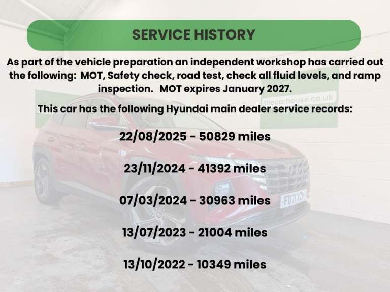 Here's a stunning example of the Hyundai Tucson, we've sold many of these recently and to say I'm impressed with the features on this car along with how it drives is an understatement. In fact I'm going to be driving this daily so please call prior to a test drive so I can ensure it's valeted! The car has just the one owner from new, and all servicing has been completed at his local Hyundai main dealer, ensuring that the car therefore has the remainder of the Hyundai warranty - the car itself is covered with unlimited mileage until 23rd February 2027, with the hybrid battery being covered for a further 3 years until 2030 or 100,000 miles (whichever comes first). Being the Premium specification it's got all the gadgets you'd desire, handy for this time of year is the all-wheel-drive, but the extra touch is the heated steering wheel and heated seats. You can also expect adaptive cruise control, premium sound system, along with Apple CarPlay/Android Auto connectivity. The car has just the one owner from new, and all servicing has been completed at his local Hyndai main dealer, ensuring that the car therefore has the remainder of the Hyundai warranty - the car itself is covered until 23rd February 2027, with the hybrid battery being covered for a further 3 years until 2030 or 100,000 miles (whichever comes first). As part of our vehicle preparation for sale we will also be providing the car with an MOT (expires January 2027)