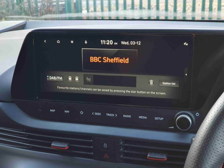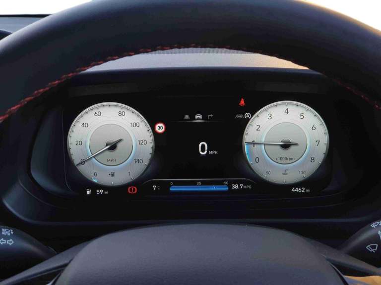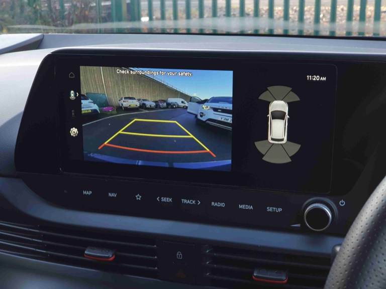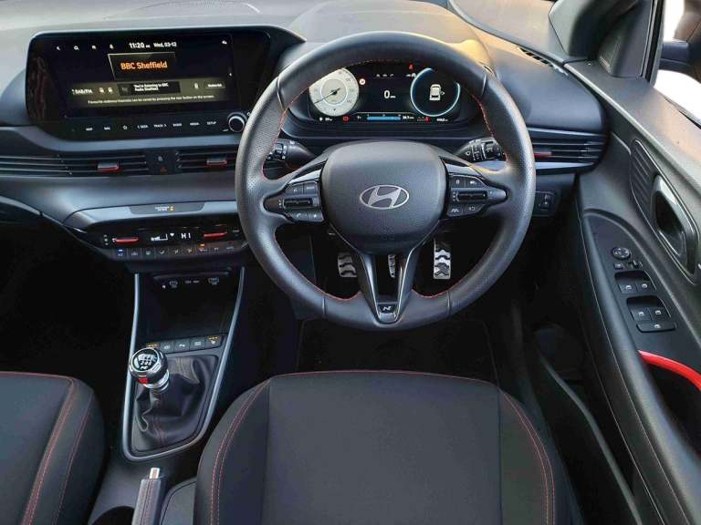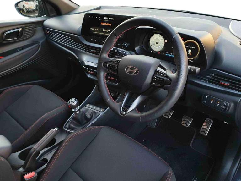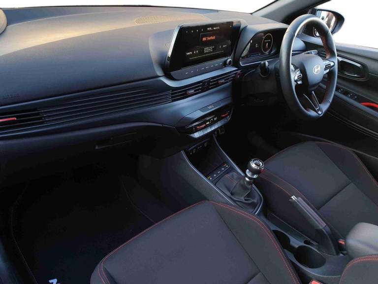 ..10.25'' Touchscreen satellite navigation including mapcare and live services, 2nd Gen eCall, 8'' Touchscreen DAB Radio with android auto and apple carplay, Apple car play/Android Auto, Blind spot Collision Warning (BCW), Cruise control + speed limiter, Driver's supervision instrument cluster with 10.25'' LCD display, E-call, Forward collision assist with car, pedestrian and cycle detection, Front parking sensor, Intelligent speed assist, Lane follow assist, Lane keep assist, MAP OTA updates, PAS, Rear parking sensor, Rear view camera with dynamic guidelines, Wireless charging pad, Bose premium sound system, USB C and USB A ports in front, USB C Port in rear, Automatic defog system for front windscreen, Automatic dimming rear view mirror, Automatic headlights with dusk sensor, Automatic windscreen wipers, Body colour door handles, Electric front and rear windows, Front fog lights, Heated door mirrors with electric adjustment and power folding function, High beam assist, LED daytime running lights, LED Headlights, LED positioning lights, LED taillights, Privacy glass - Rear windows and tailgate, Rain sensor, Rear roof spoiler with integrated LED brake light, Rear side wing doors, Rear wiper, Repositioned flat metal hyundai emblem, Shark fin antenna, Windscreen acoustic film, 3 seat bench in 2nd row, Adjustable head restraints, Air conditioning climate control, Automatic de-fog system for front windscreen, Cloth upholstery, Driver and passenger illuminated vanity mirrors with driver ticket holder, Floor mats, Front cup holder, Heated front seats, Heated steering wheel, Height adjustable driver's seat, Isofix, Leather wrapped steering wheel and gear knob, Luggage hooks, Multi colour ambient lighting, Rear Seats - Split Folding (60/40), Single front passenger seat, Sport metal pedals, Steering wheel remote controls, Tilt and telescopic steering wheel adjustment, 3x3 point rear seatbelts, Anti-lock brake system (ABS), Autonomous emergency braking, Child locks on rear doors, Driver and front passenger airbags, Rear seat alert, Side and Curtain airbags, Tyre pressure monitoring system, Immobiliser, Smart key with keyless entry and engine start/stop button, 17'' N Line black alloy wheels, Tyre repair kit