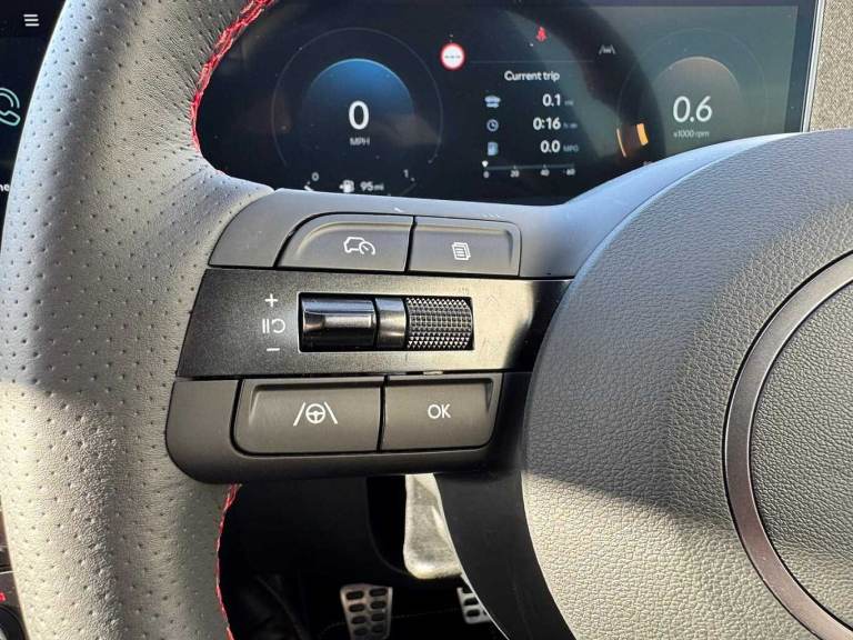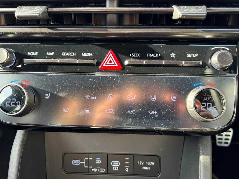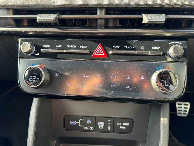 ..Exterior Features, Adjustable intermittent front windscreen wipers with aero wiper blade, Automatic defog system, Automatic windscreen wipers with rain sensor, Front and rear electric windows with anti-trap mechanism and one touch control, Privacy glass - Rear windows and tailgate, Rear wash/wipe with intermittent wipe setting, Tinted glass with windscreen shade band, Body colour bumpers, Body colour exterior door handles, Body coloured wheel arches, Glossy black bumper mouldings, Rear side wing doors, Roof rails, Soft touch rear door paneling, Automatic headlights with dusk sensor, Follow me home headlights, Front fog lights, LED 3rd brake light, LED daytime running lights, LED Headlights, LED rear lights, Positioning Lights - LED, Safety, Anti-lock brake system (ABS), Brake assist function, Downhill brake control, Electric parking brake, Electronic stability control, Hill start assist control (HAC), Multi-Collision braking, Traction control, Vehicle stability management, Cruise control, Drive mode selector, Driver attention warning, Emergency stop signalling system, Forward Collision Avoidance Assist (FCA) - Car, Pedestrian and Cycle, Forward Collision Avoidance Assist Junction Turning (FCAJX), Front and rear parking sensors, Intelligent speed limit assist, Lane follow assist, Lane keep assist, PAS, Rear camera and guidance parking system, Auto dimming rear view mirror, Body colour door mirrors with integrated indicators, Electrically adjustable, heated and power folding door mirrors, 3x3 point rear seatbelts, Active bonnet, Airbag - Front, front side, curtain and centre front airbags, Childproof rear door locks, Curtain airbag roll over sensor, Front and rear seatbelt reminder, Front passenger airbag deactivation switch, Front seatbelt pretensioners, Outer rear seatbelt height adjustment, Seatbelt height adjustment for front seats, Tyre pressure monitoring system with individual tyre pressure display - TPMS, Audio / Communications, Bluetooth system, E-call, Voice recognition, Wireless Apple CarPlay/Android Auto, Wireless phone charging pad, 2 front and 2 rear speakers with 2 tweeters, 2 front and 2 rear USB-C ports, DAB Digital radio, Steering wheel mounted audio/phone controls, Driver Convenience, Hyundai road side assistance, Smart power tailgate, Miscellaneous, 12.3'' LCD display with driver's supervision instrument cluster, 12.3'' widescreen navigation with bluelink and mapcare, Digital clock, Over the air updates(OTA), Rev counter,