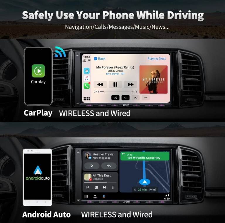 * Fast and automatic connection: For wireless CarPlay/Android Auto, the Bluetooth connection is quick. And after you make the connection for the first time, it will all be automatic. For wired CarPlay/Android Auto, once you plug your iPhone/Android phone into the "Phone Link" port on A6 PF, it takes about 3 seconds for CarPlay/Android Auto to be automatically launched. A true plug-n-play function.