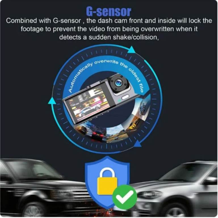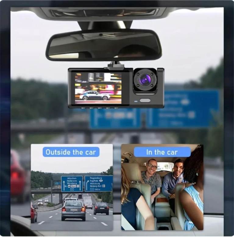 · Dual-lens camera: The product is equipped with three cameras in front and inside the car, which can comprehensively observe the road conditions in front and inside and behind.