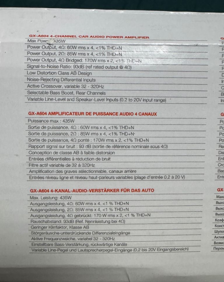 Amplifier Power (RMS) 4 ohm... 60W x 4, <1% THD+N