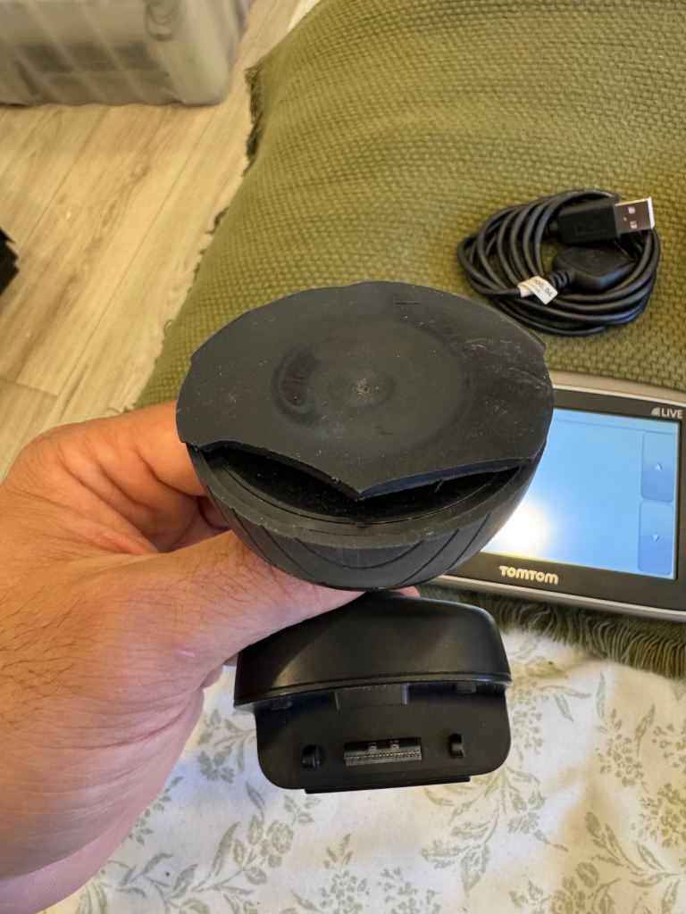 Tom Tom satnav. Mounting suction bit is damaged but still sticks to windscreen.
