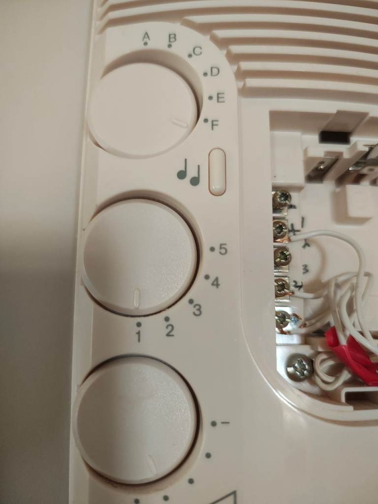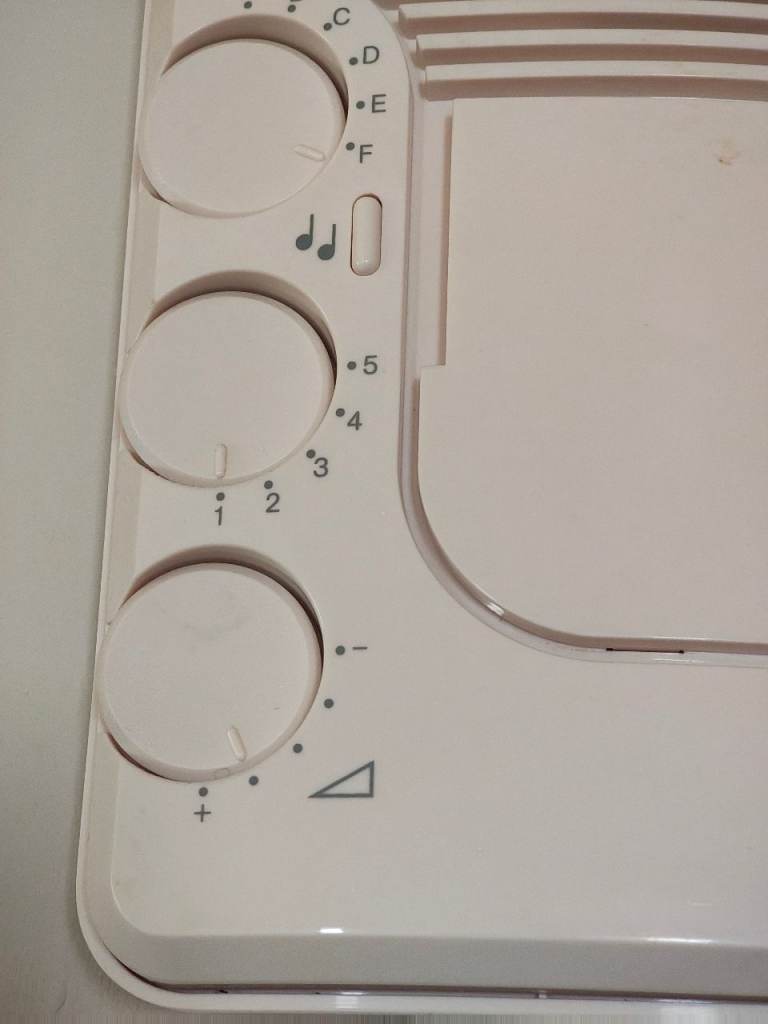 Beige colour, with 30 different selectable tones using the top and middle selectors, with adjustable ring level on the bottom switch.